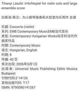 布达佩斯乐谱书 14126 solo 小提琴和大型室内乐而作 总谱 large Tihanyi Laszlo score 拉斯洛 Irrlichtspiel ensemble violin