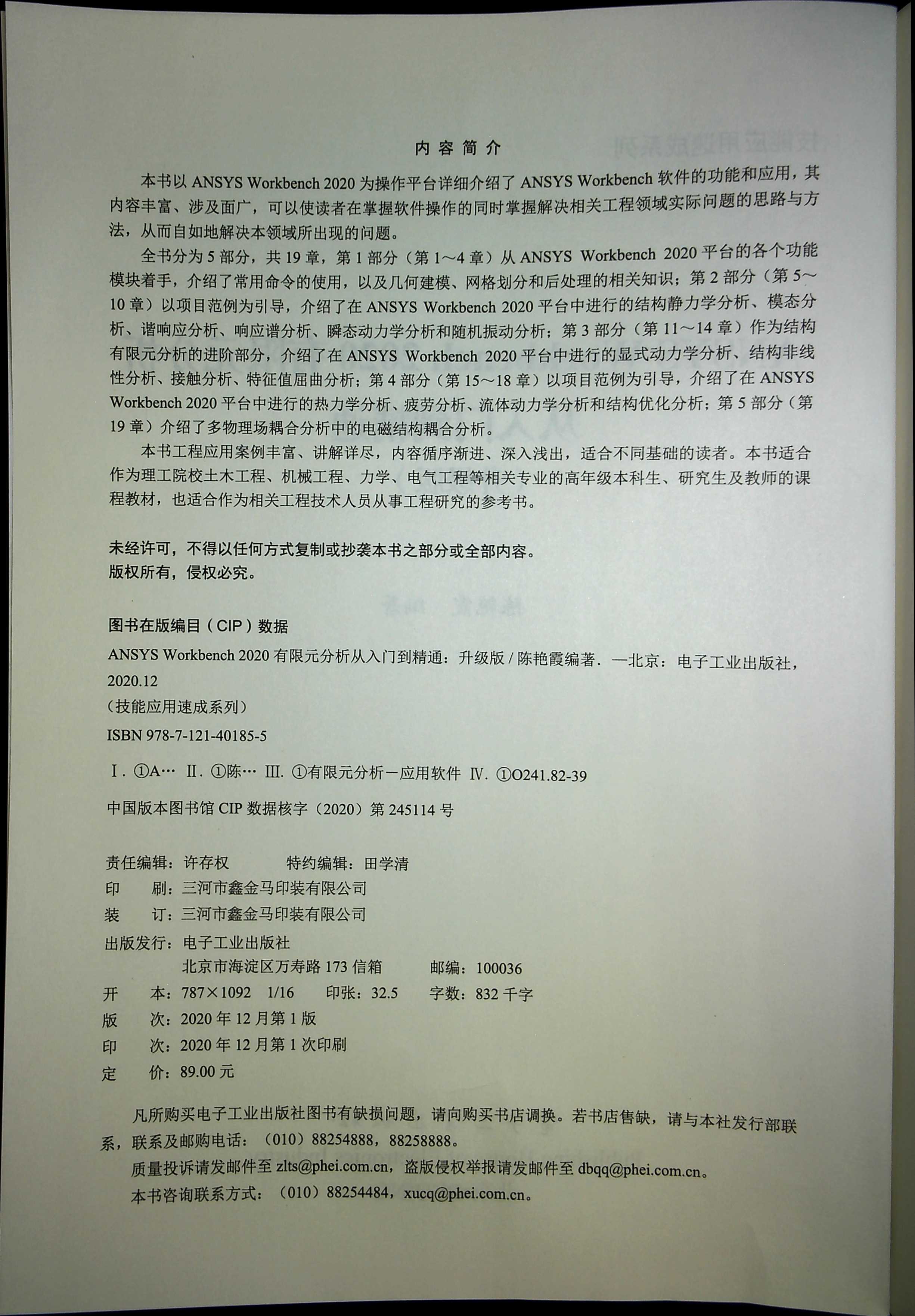 技能应用速成系列 仪器仪表书籍 Workbench 机械 结构静力学 陈艳霞 升级版 分析从入门到精通 2020有限元 ANSYS 官方旗舰店