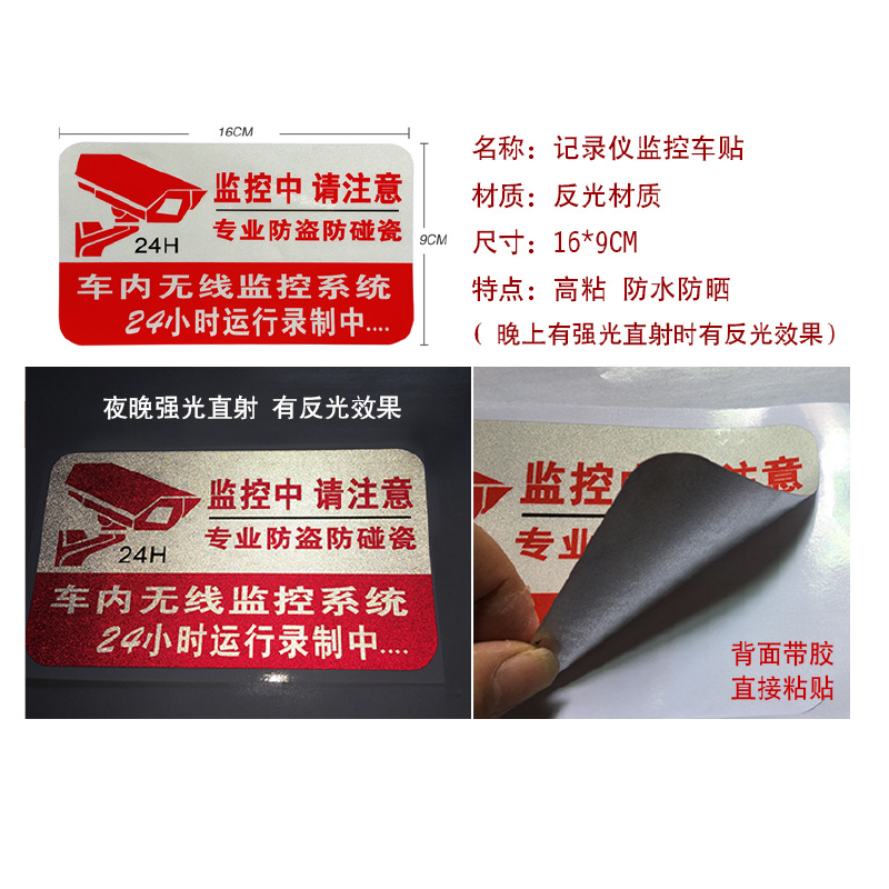 24小时车内无线监控防盗反光汽车贴 记录仪警示贴纸 记录监控车贴