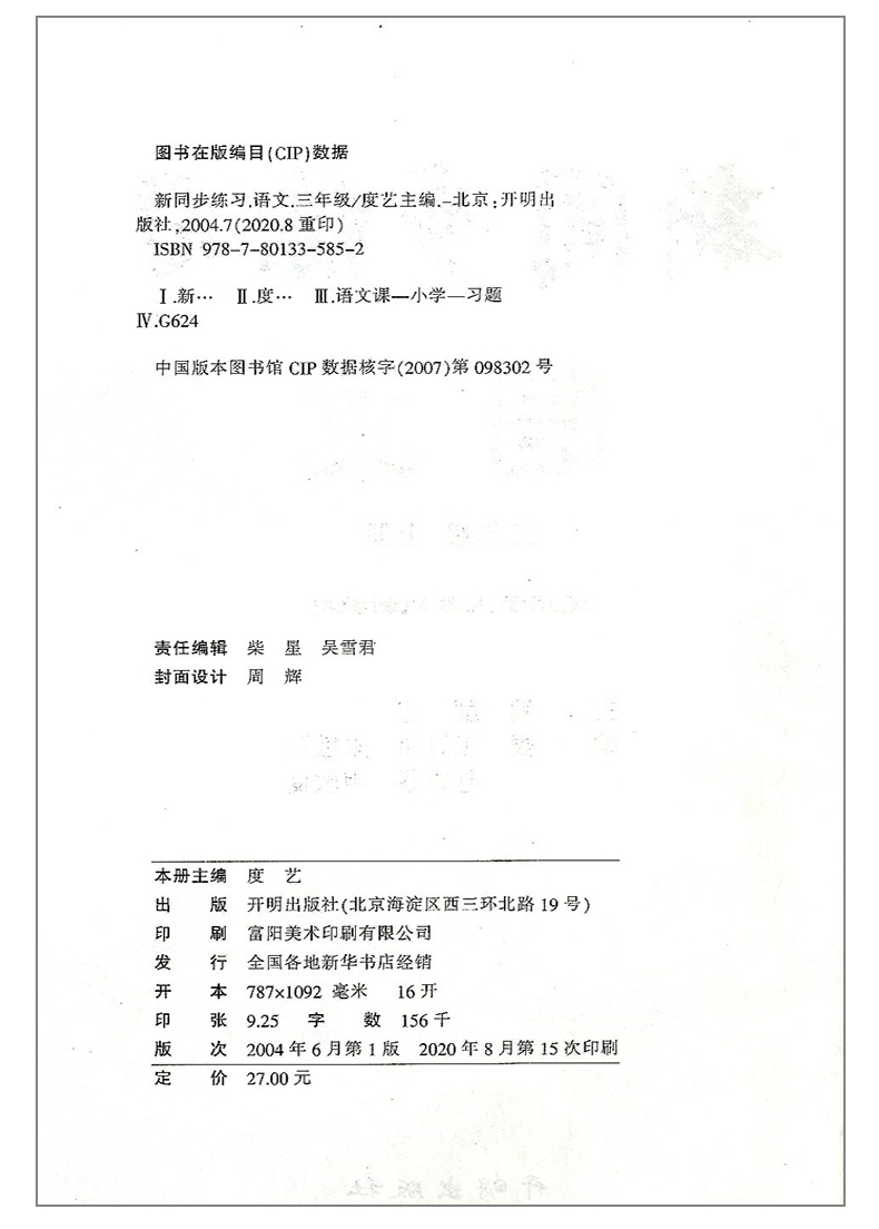 2020秋新同步练习语文三年级上册部编人教版 社课堂作业本小学同步课时训练3年级上每课一练配套练习随堂天天练课时特训题 开明出版
