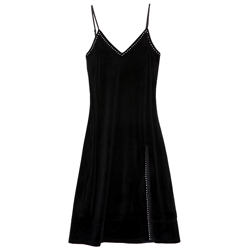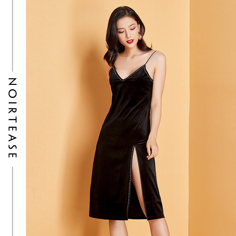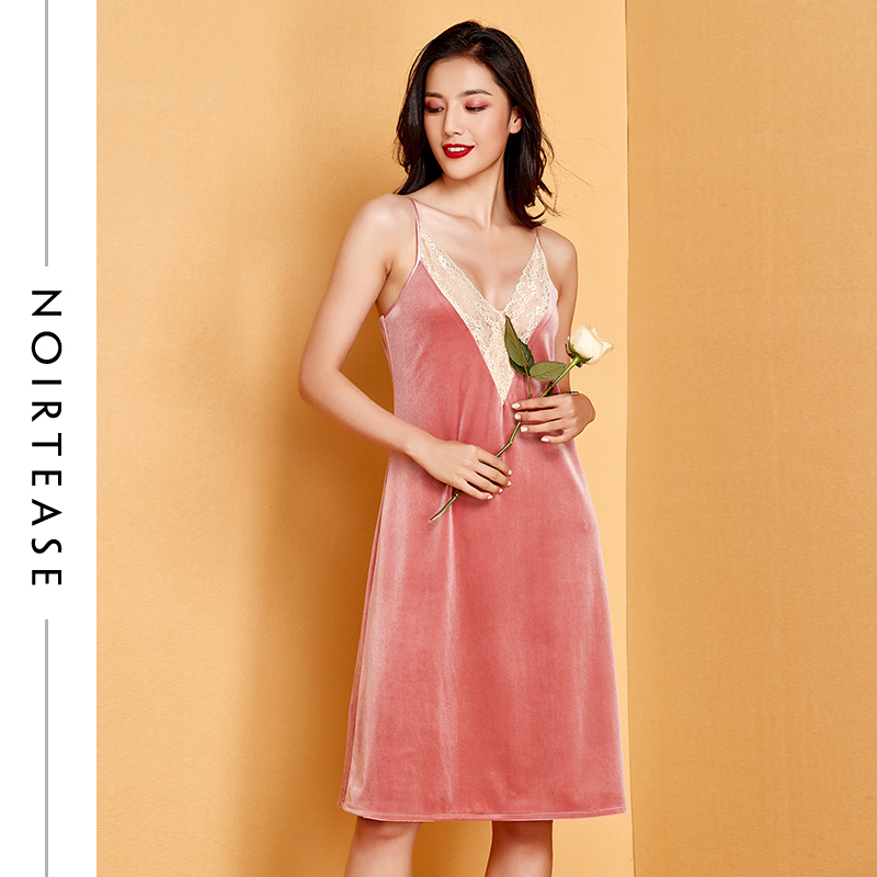 NoirTease女士性感丝绒吊带打底睡衣春秋中长款 水钻蕾丝睡裙女秋