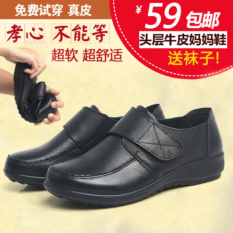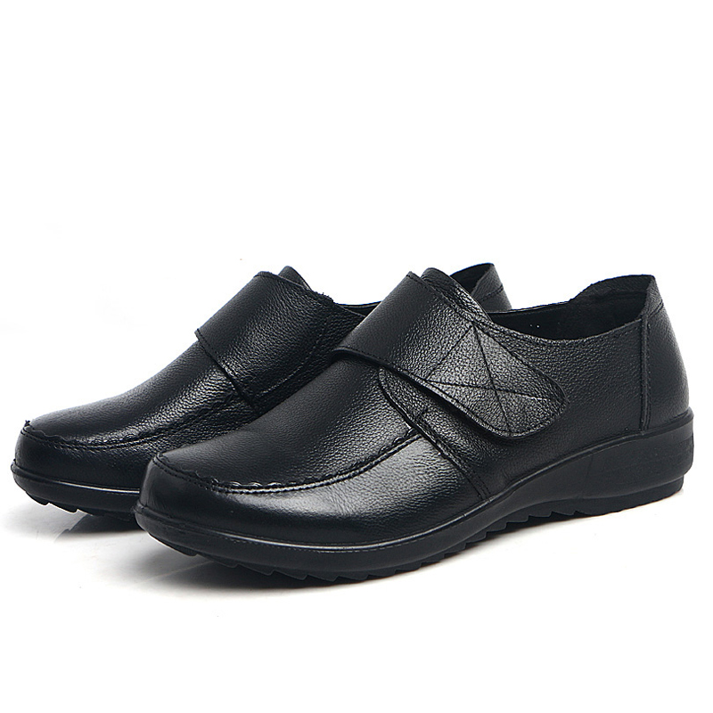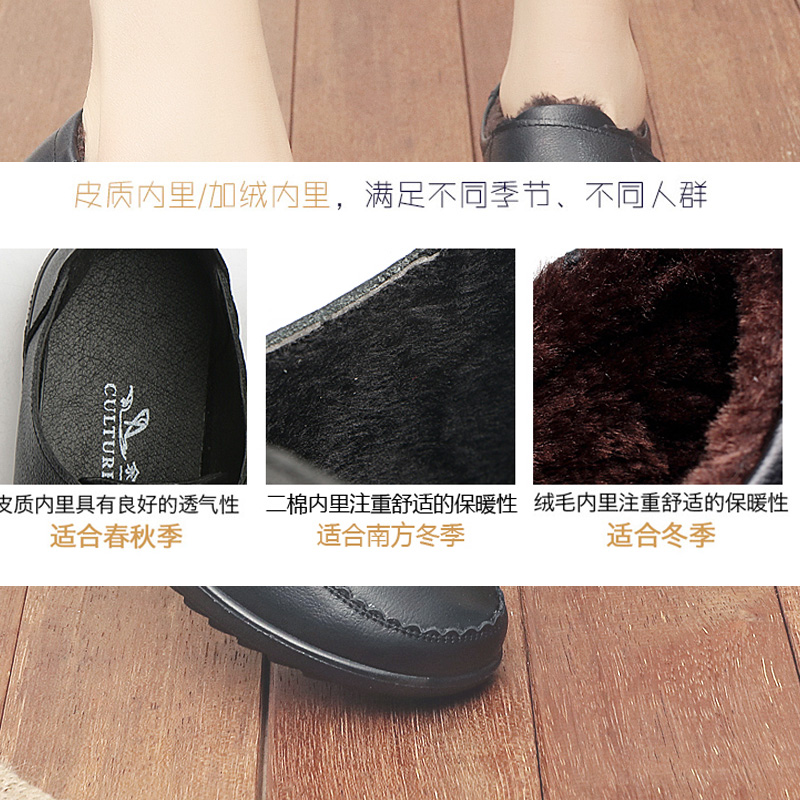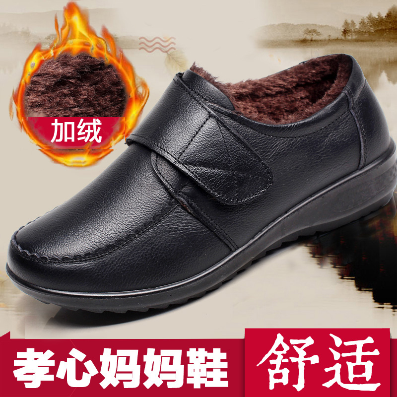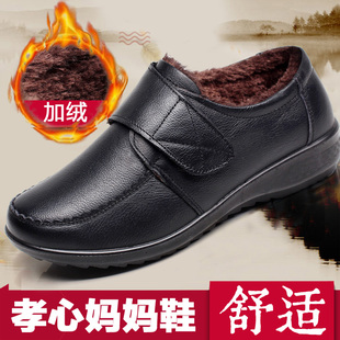 真皮妈妈棉鞋 老太太皮鞋 平底加绒中老年保暖工作鞋 大码 女软底单鞋