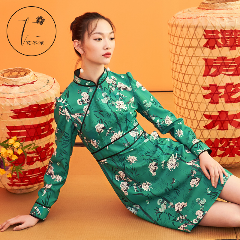 花鸟印花裙子 女装 花木深中国风改良旗袍连衣裙女秋时尚 A字裙中式