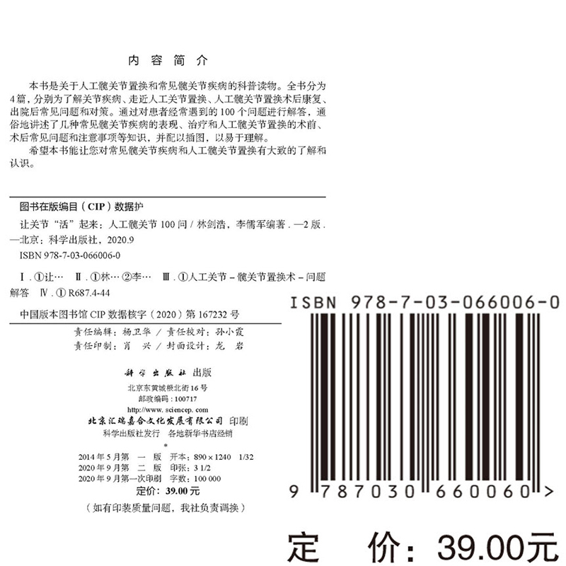 社林剑浩李儒军9787030660060 二科学出版 现货 让关节活起来人工髋关节100问第2版