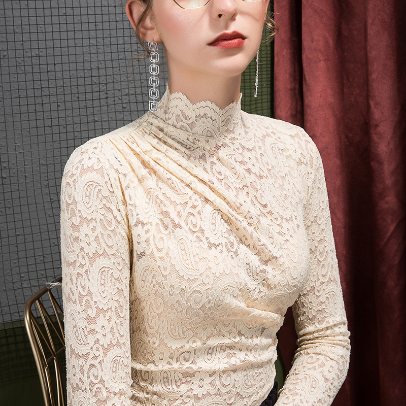 新款 小衫 高领蕾丝打底衫 洋气秋冬性感洋气褶皱时尚 女修身 2025秋季