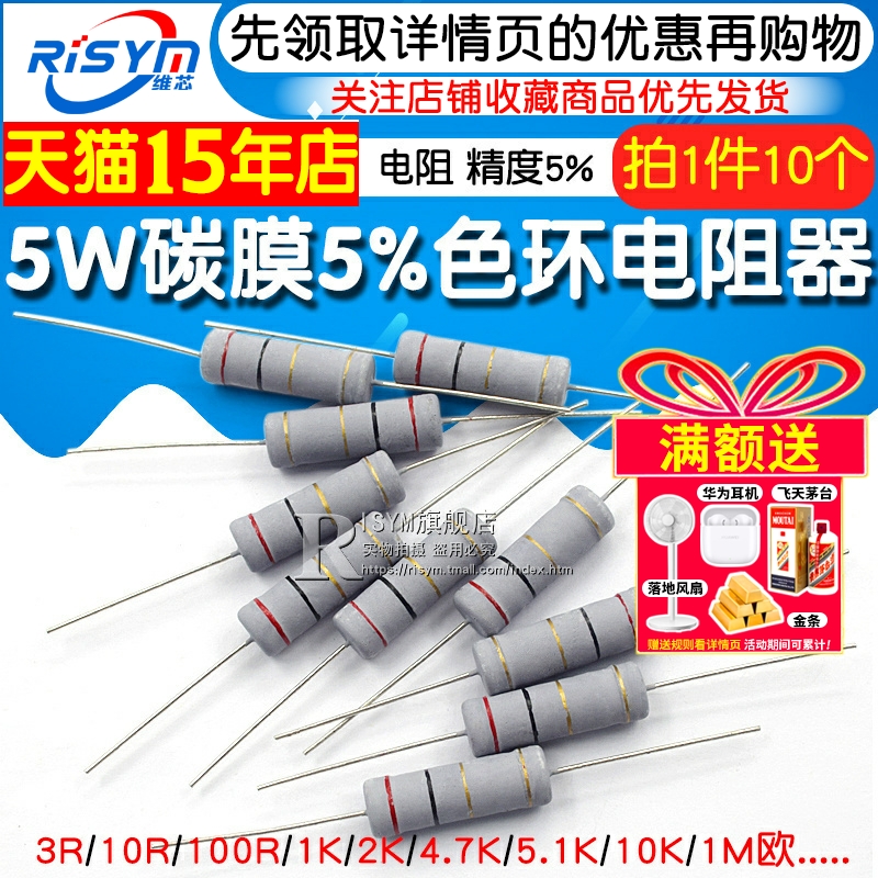 5.1K 1M欧 100R 100K 10K 4.7K 10R 5W碳膜5%色环电阻3R