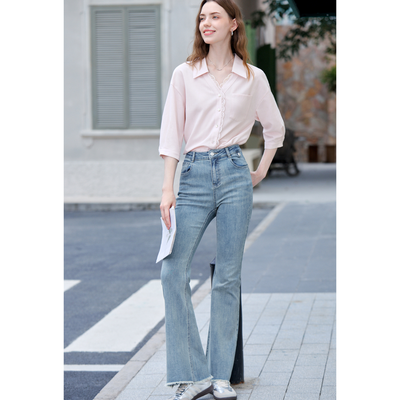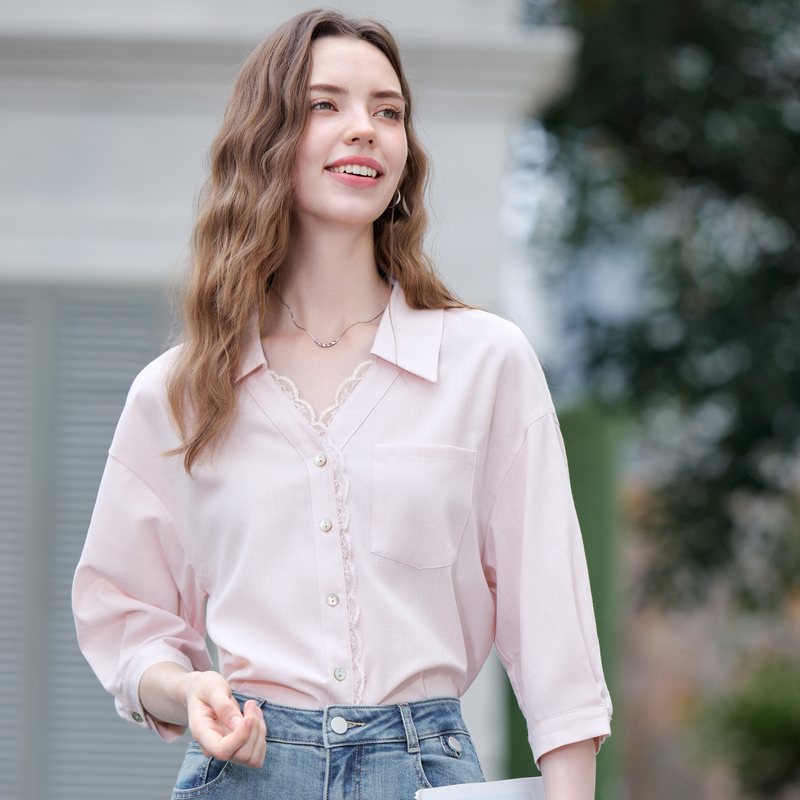 新款 2025年夏季 宽松显瘦衬衣 女七分袖 betu百图粉色蕾丝花边衬衫