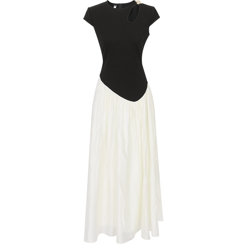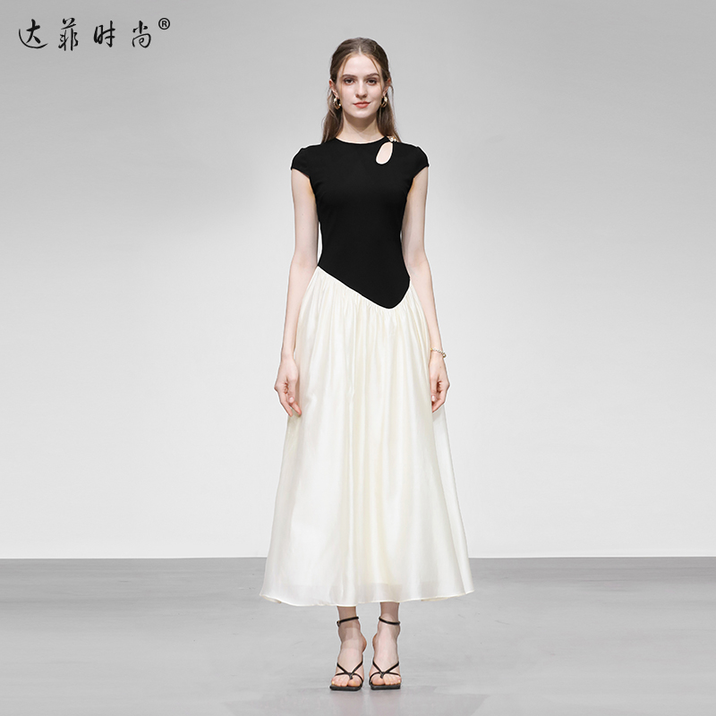 显瘦撞色拼接大摆天丝连衣裙 优雅气质圆领设计感修身 2025夏季 新款