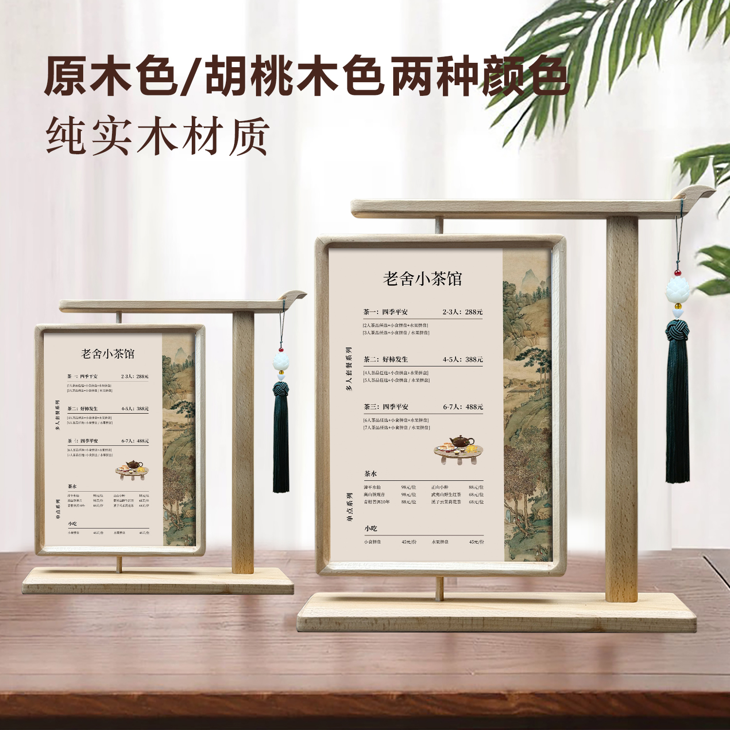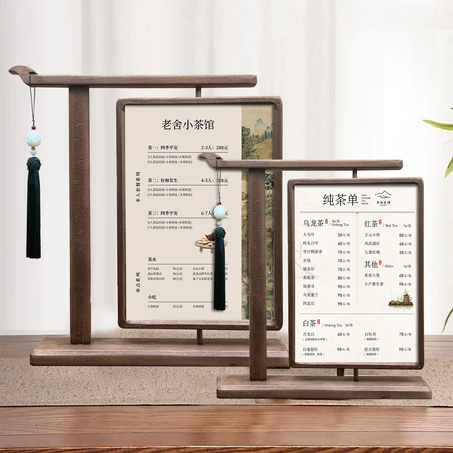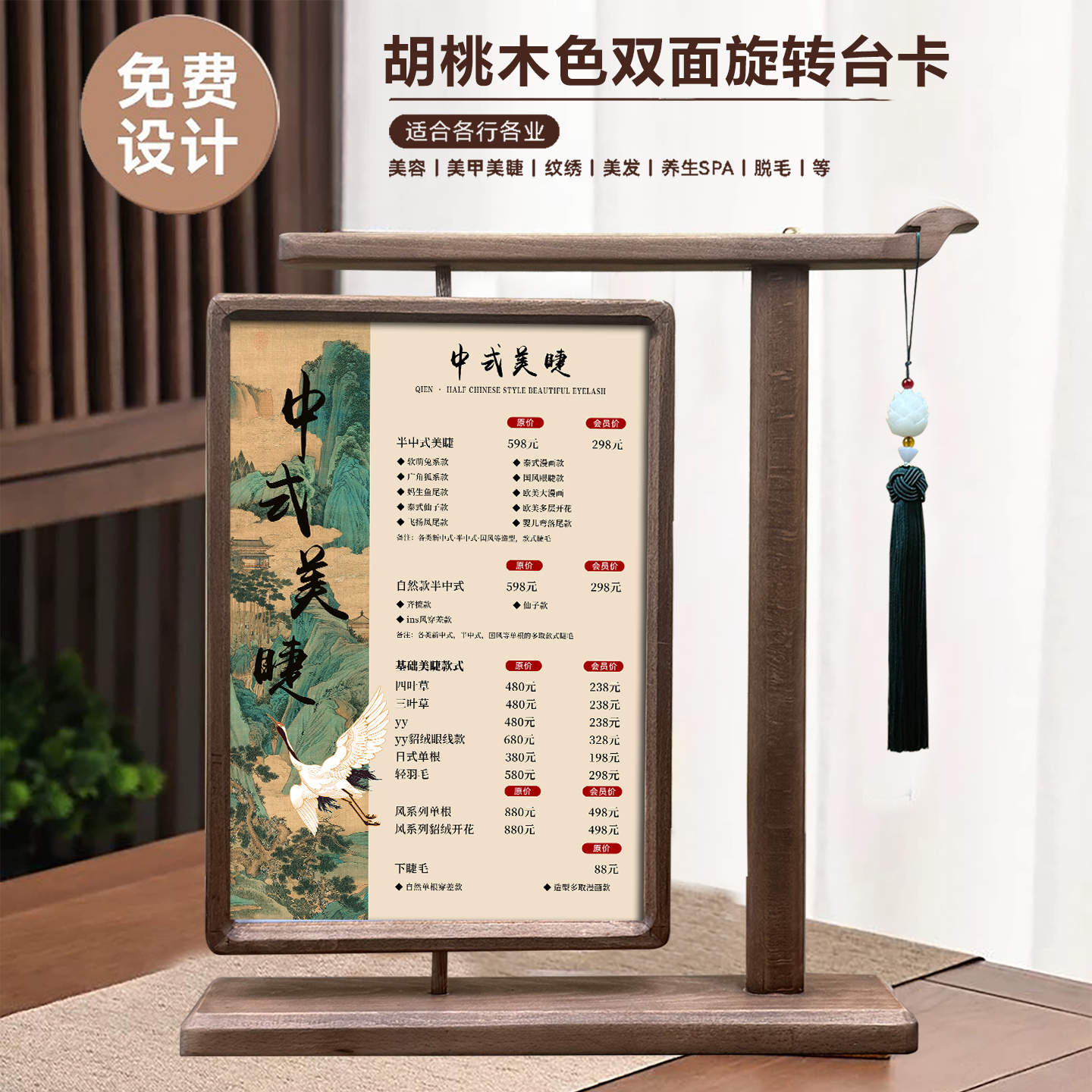 新中式 茶室茶水单价目表胡桃木展示牌设计定制复古美容院美甲美睫价格表木质双面旋转摆台卡养生纹绣摆台桌牌