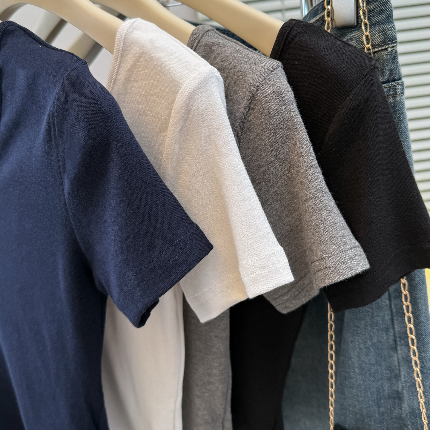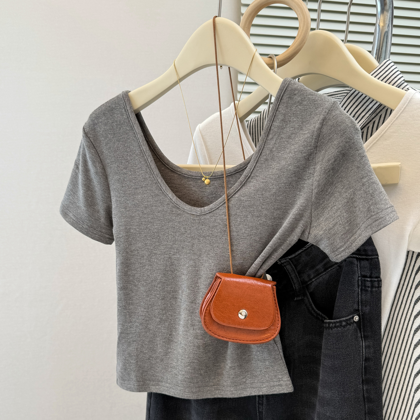 T恤女夏季 正肩露锁骨上衣半袖 韩版 短款 修身 chic甜辣V领大领口短袖