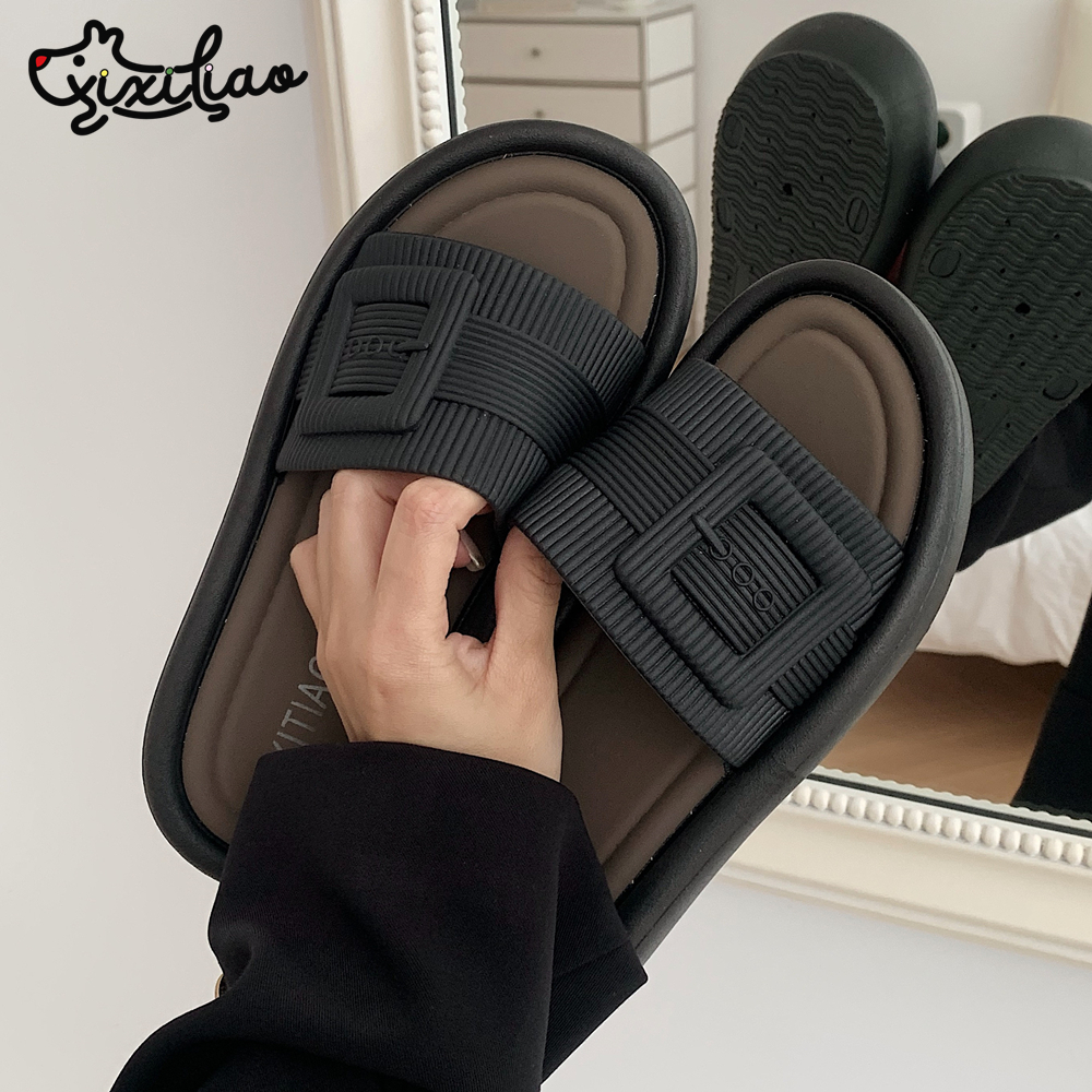 拼色休闲软平底防滑女士居家凉拖鞋 创意方扣外穿拖鞋 时尚 韩版 夏季