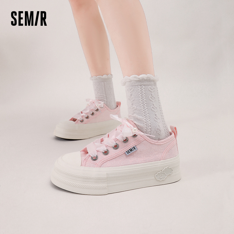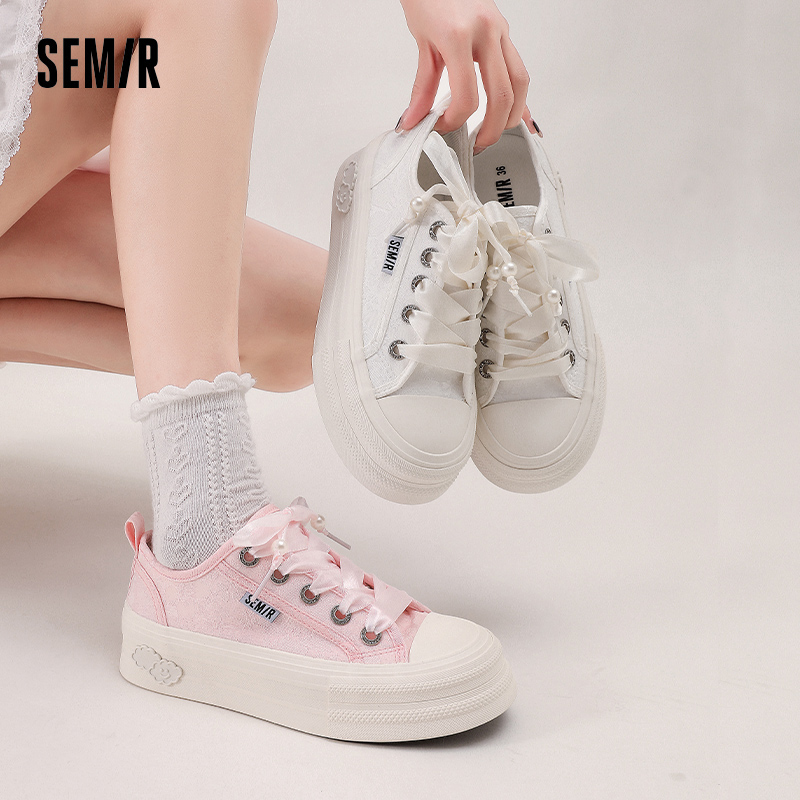 透气百搭厚底珍珠丝带樱花粉帆布鞋 Semir女鞋 新款 2025春秋季 板鞋