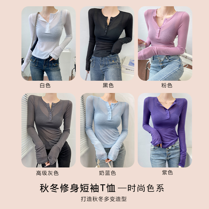 纽扣修身 女长袖 显瘦薄纱网纱透视t恤 上衣微透打底衫 黑色早秋薄款
