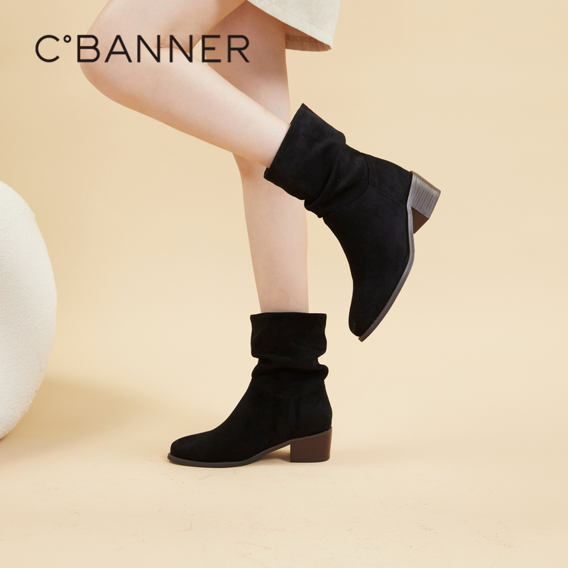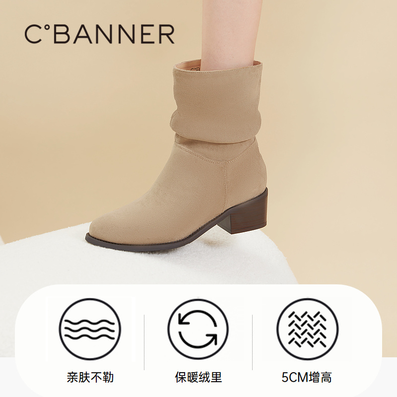 千百度靴子尖头加绒女短靴时尚 西部靴保暖堆堆靴