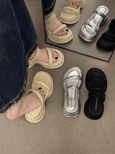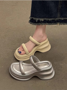 轻便防滑休闲一字拖鞋 羊皮版 外穿新款 女夏季 8CM厚底增高凉拖鞋