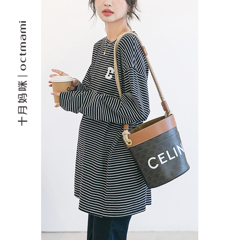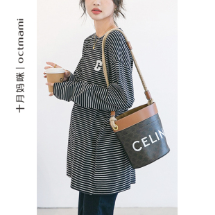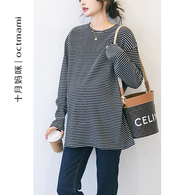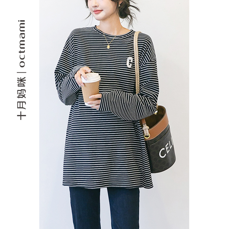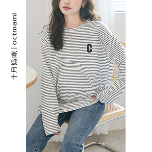 怀孕期宽松圆领条纹上衣秋装 十月妈咪孕妇长袖 T恤春秋内搭打底衫