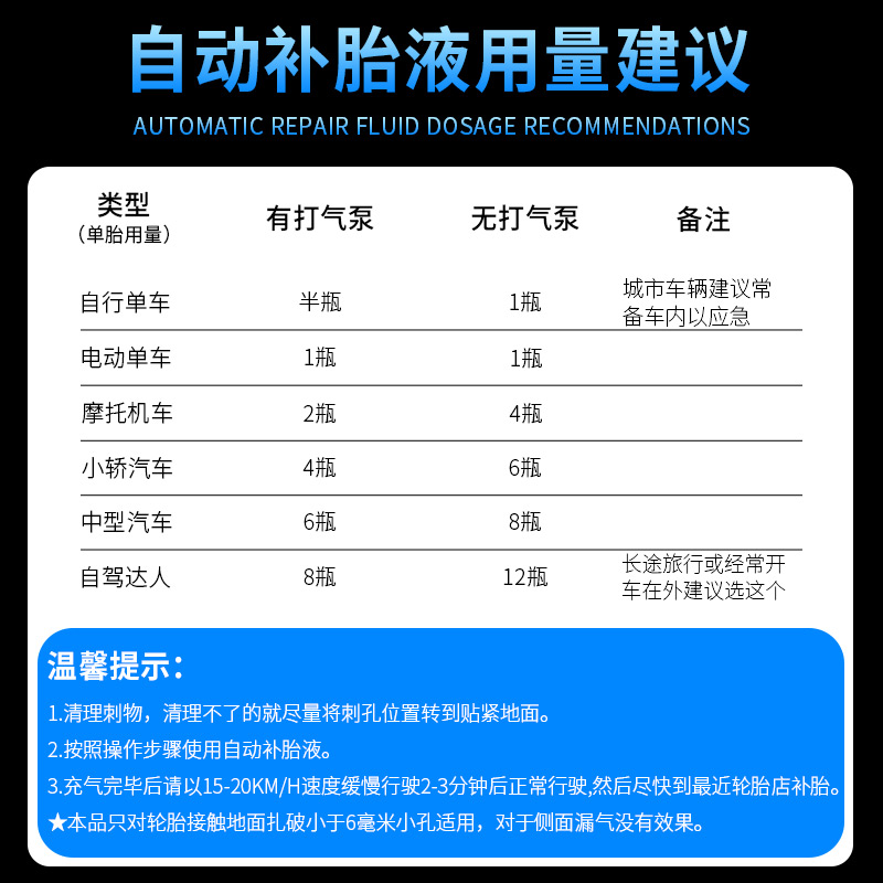 仆旅汽车轮胎快速充气自动补胎液摩托车电动车真空胎应急修补神器