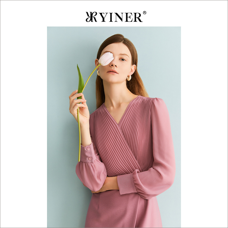YINER音儿专选女装 春秋质感收褶V领香芋粉收腰连衣裙