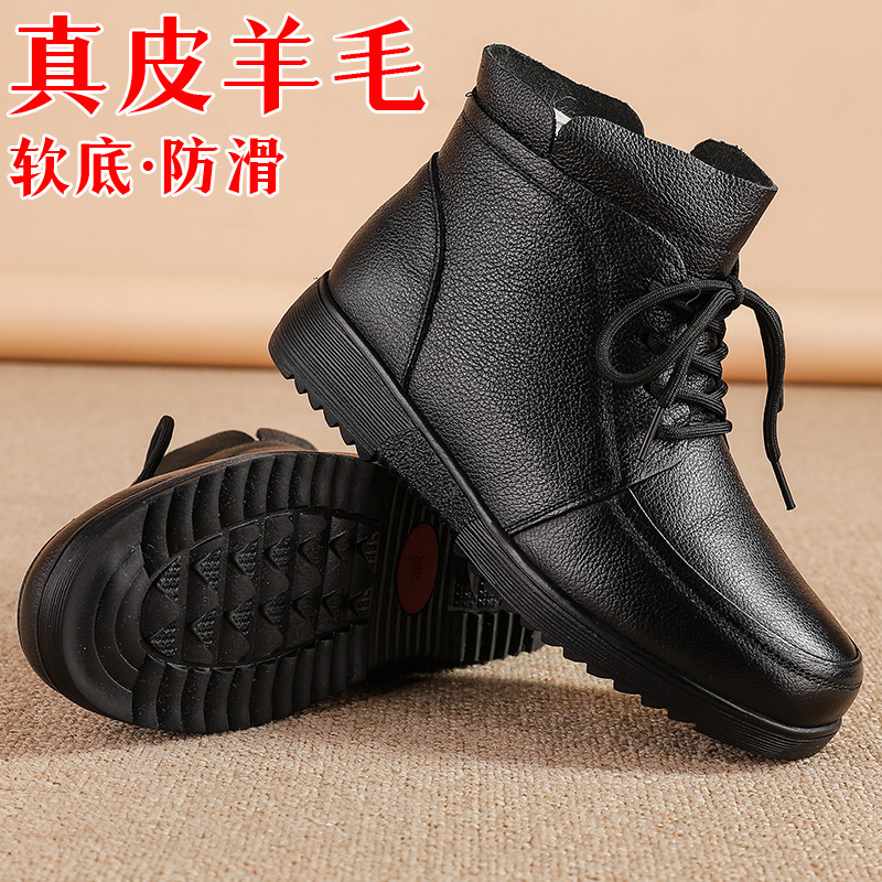 女鞋 冬季 大码 平底加绒加厚羊毛短靴保暖中老年棉皮鞋 真皮妈妈鞋