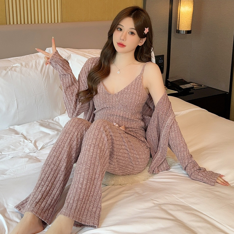 家居服磨毛薄绒 带胸垫冬季 性感睡衣女秋冬长袖 吊带三件套2025新款