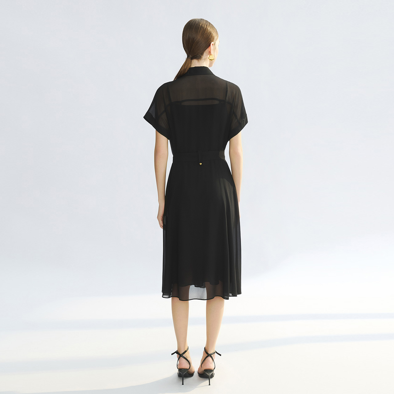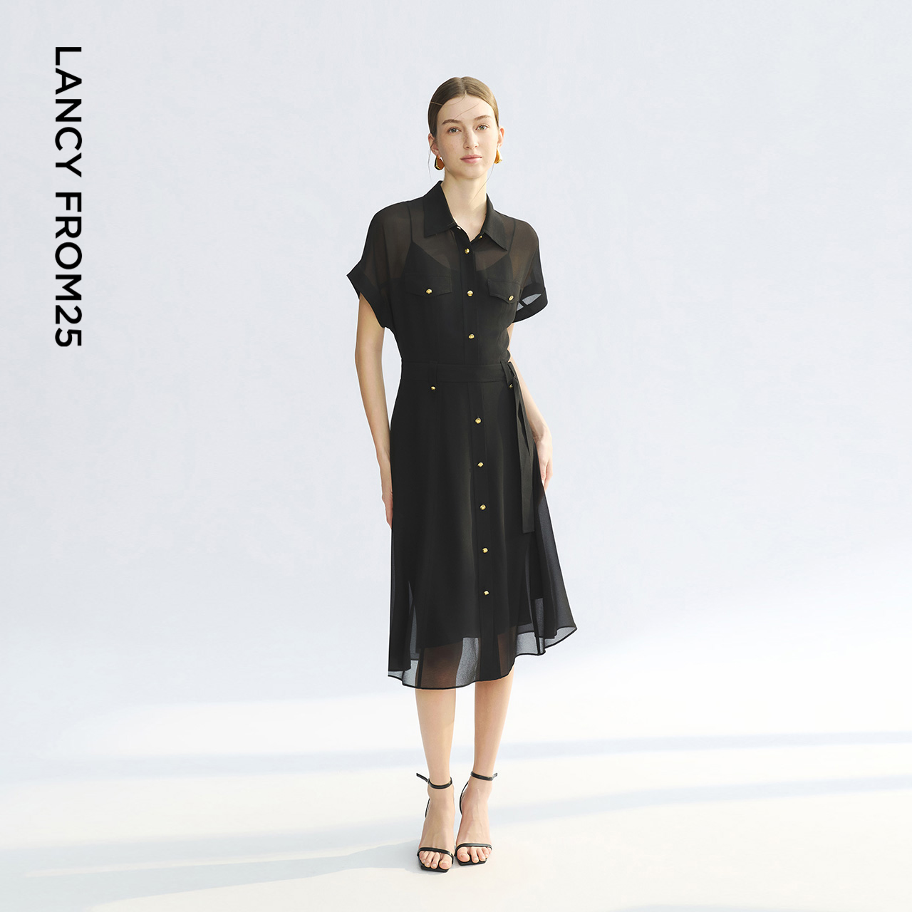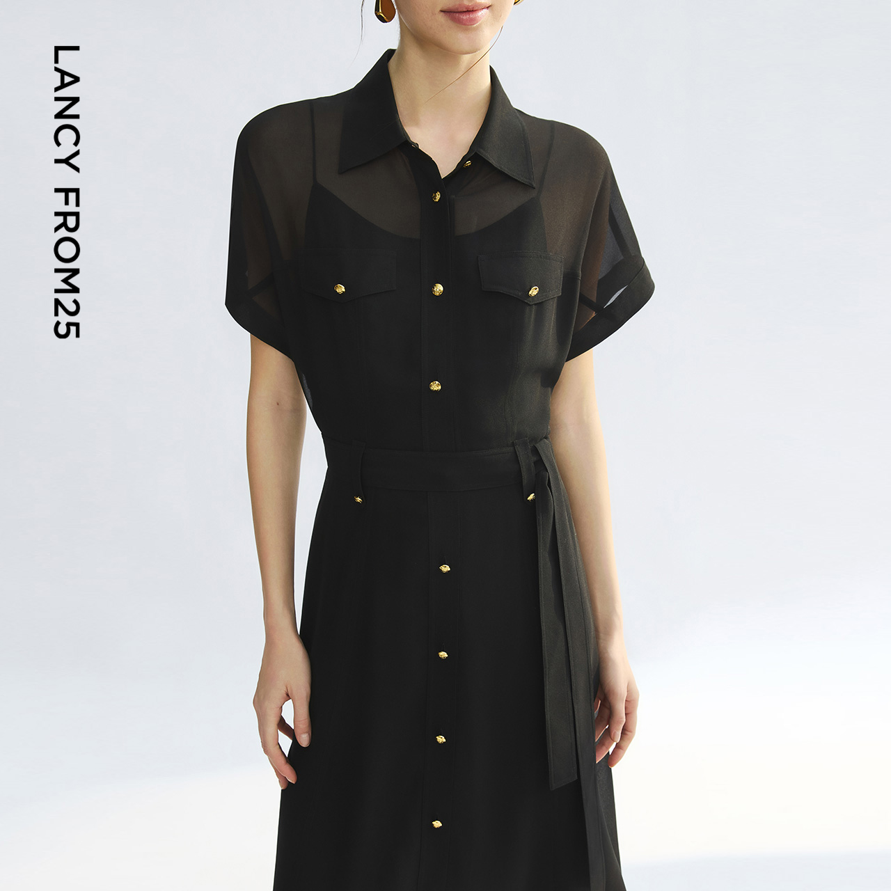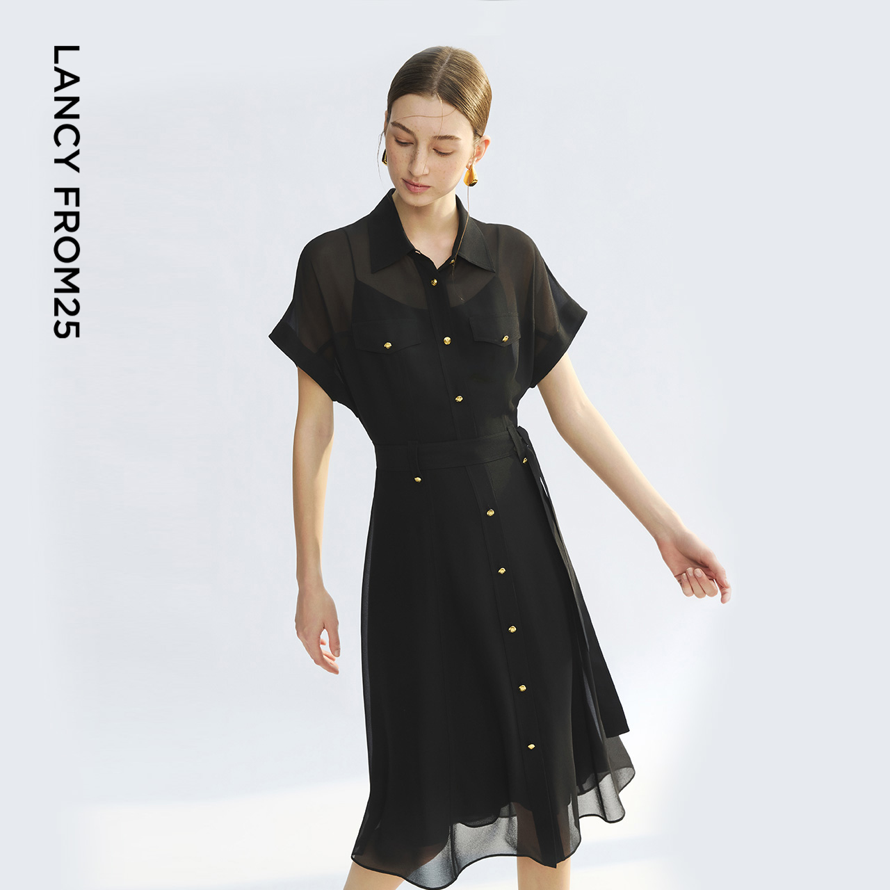 朗姿奥莱 法式 朗姿衬衫 新款 通勤独特设计 领小黑裙气质2025年夏季