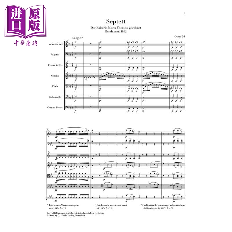 major 非演奏用谱 HN9025 flat Septet 降E大调 研习小总谱 中商原版 贝多芬 七重奏op20 Beethoven 预售 进口艺术