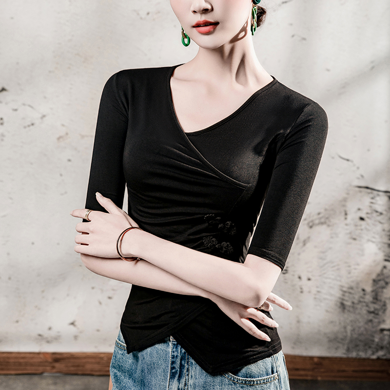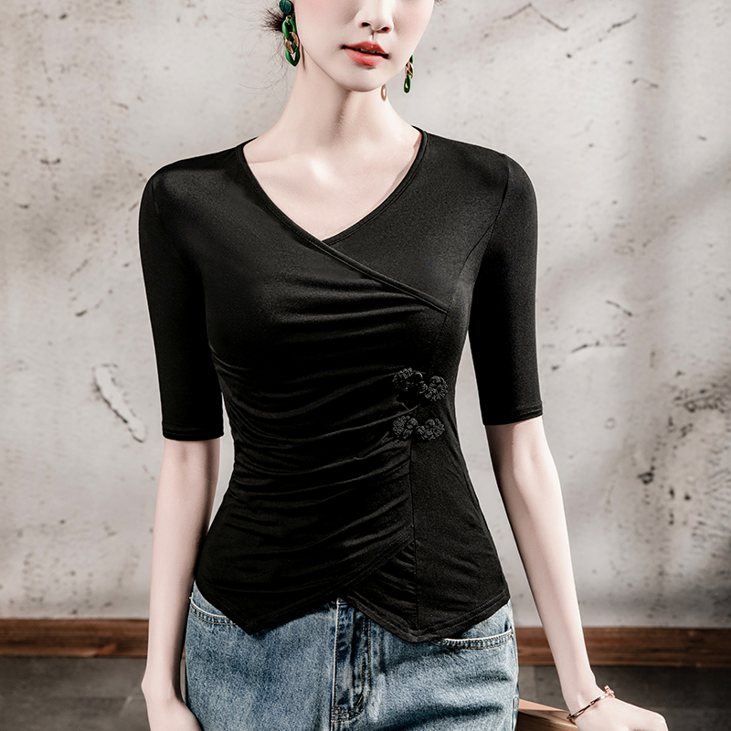 饰T恤女五分袖 褶皱拼接开叉女装 2025秋季 半袖 上衣 新款 V领盘扣装