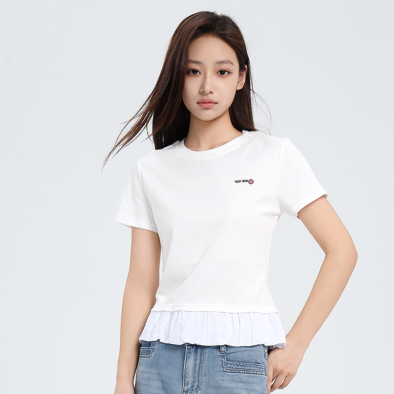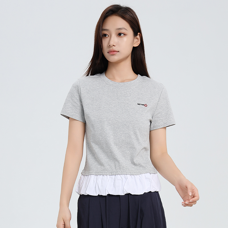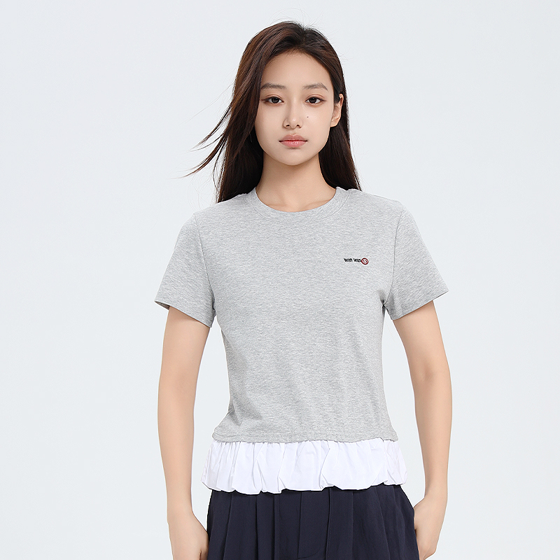T恤女上衣潮F252129 假两件拼接网纱花边短袖 金苑2025夏季 新款