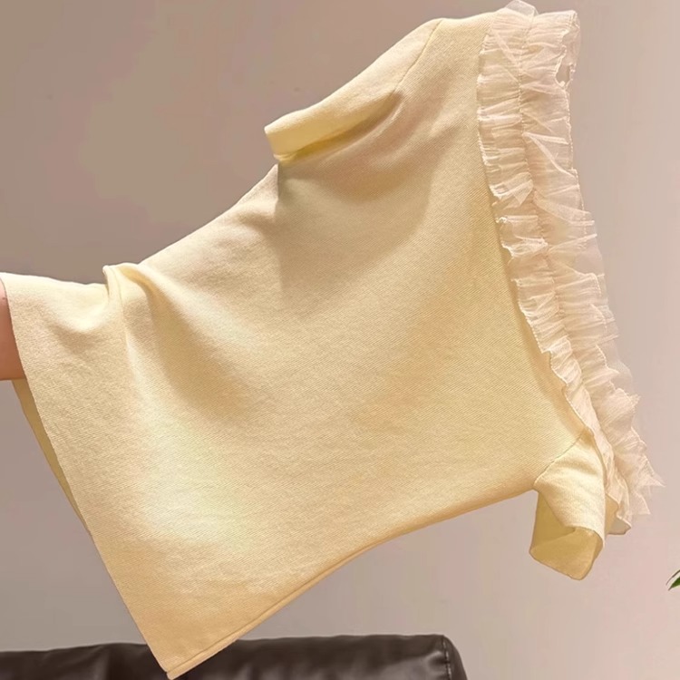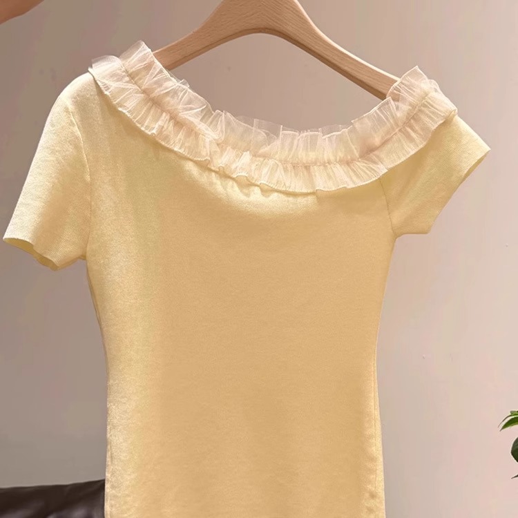 短款 胖mm2025夏天露肩修身 上衣 T恤女大码 纯欲花边领蕾丝拼接短袖