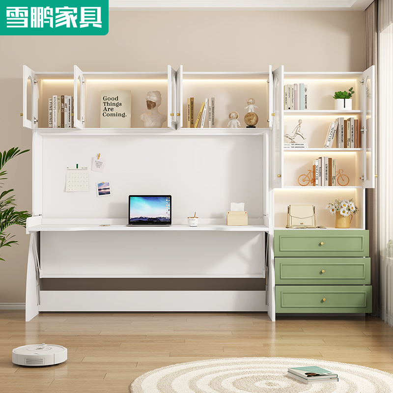 法式 奶油风单人隐形床书桌一体家用书房折叠翻转床书柜组合6CH33