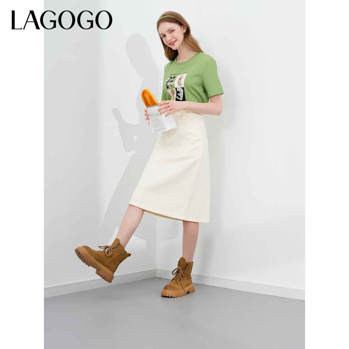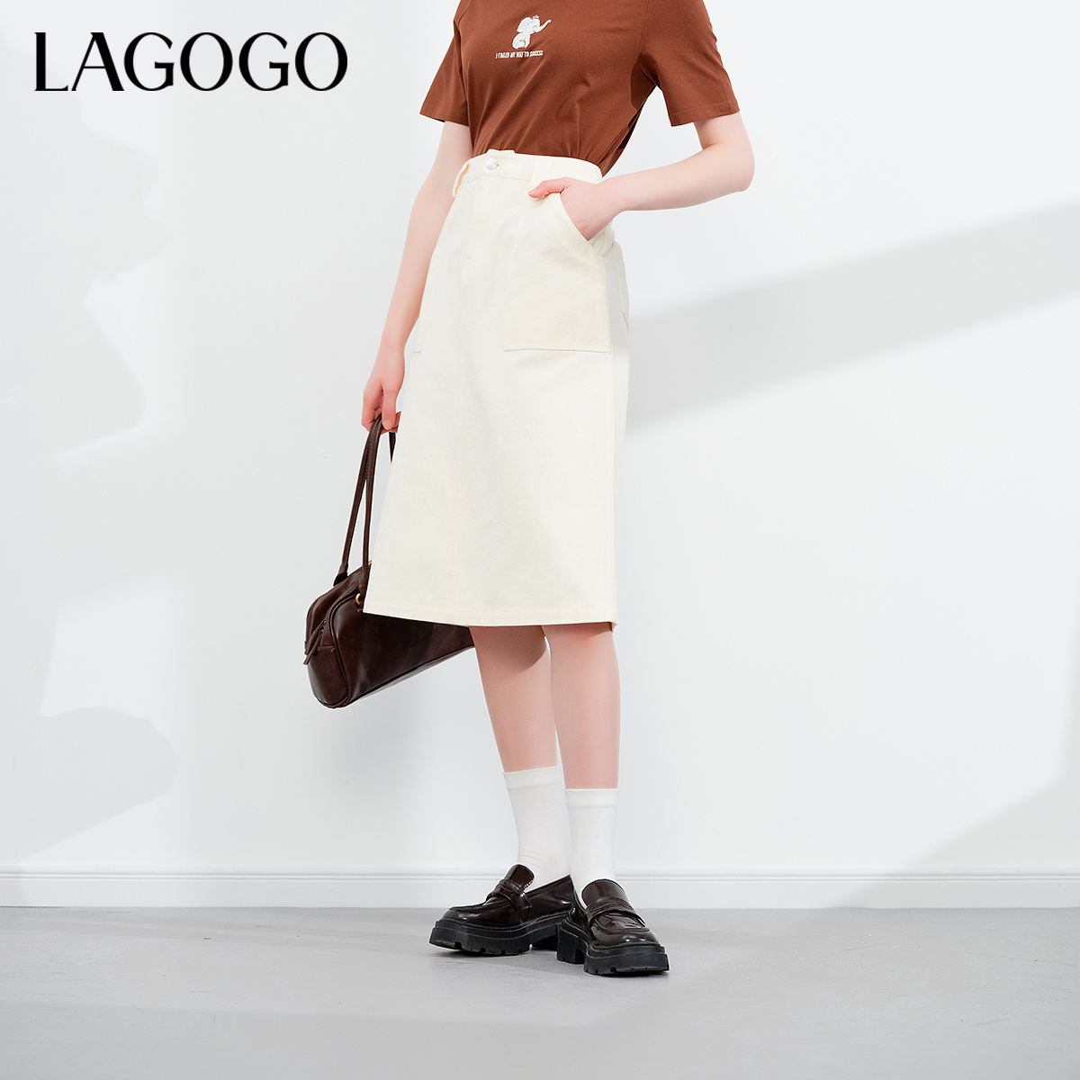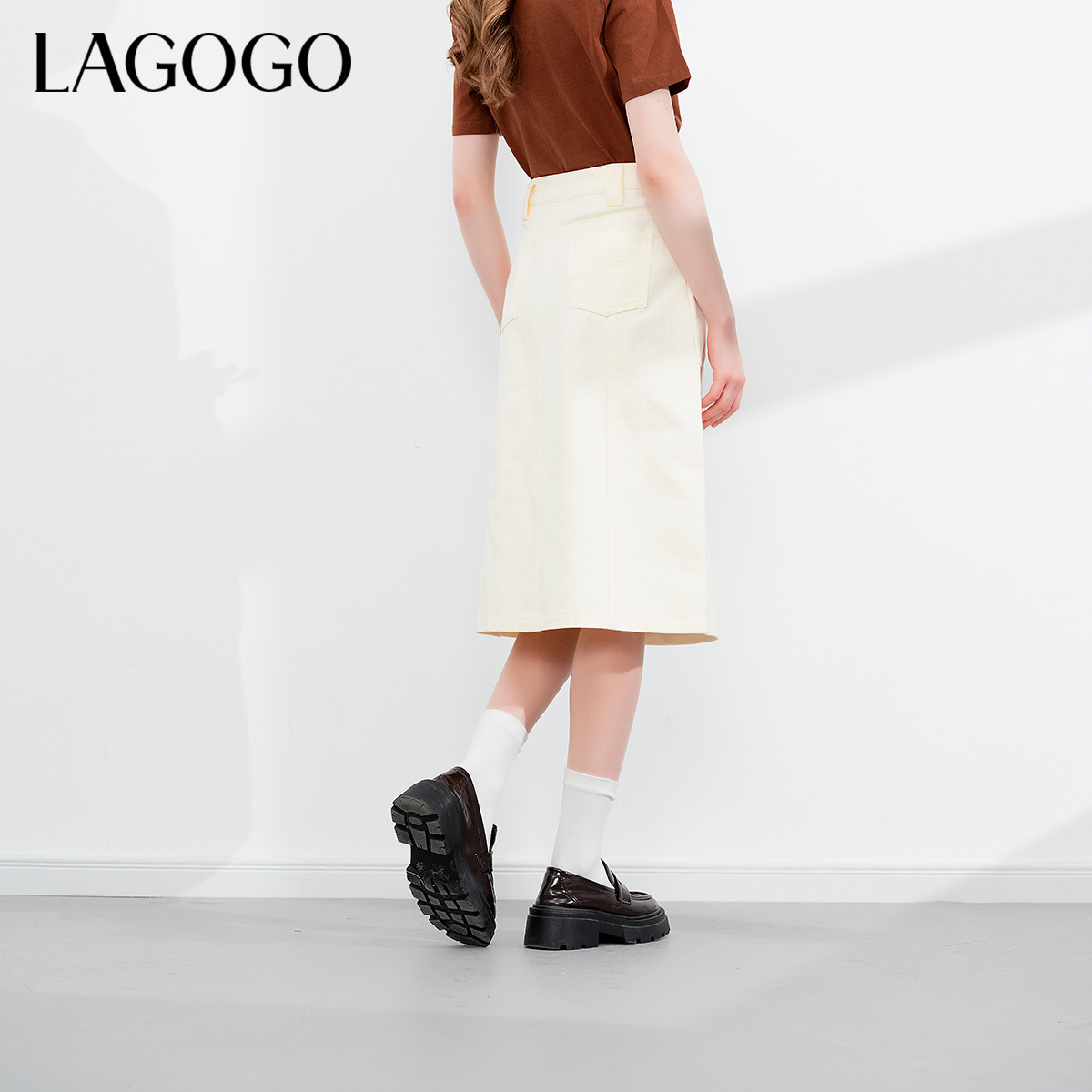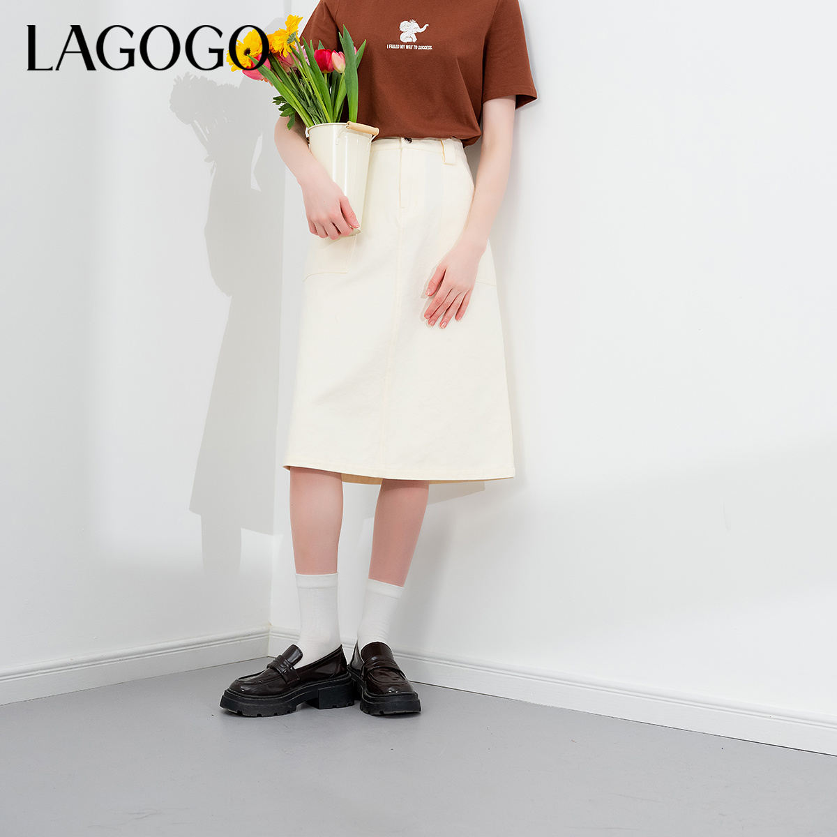 LAGOGO米白色牛仔半身裙女拉谷谷春夏新款 通勤百搭休闲A字中长裙