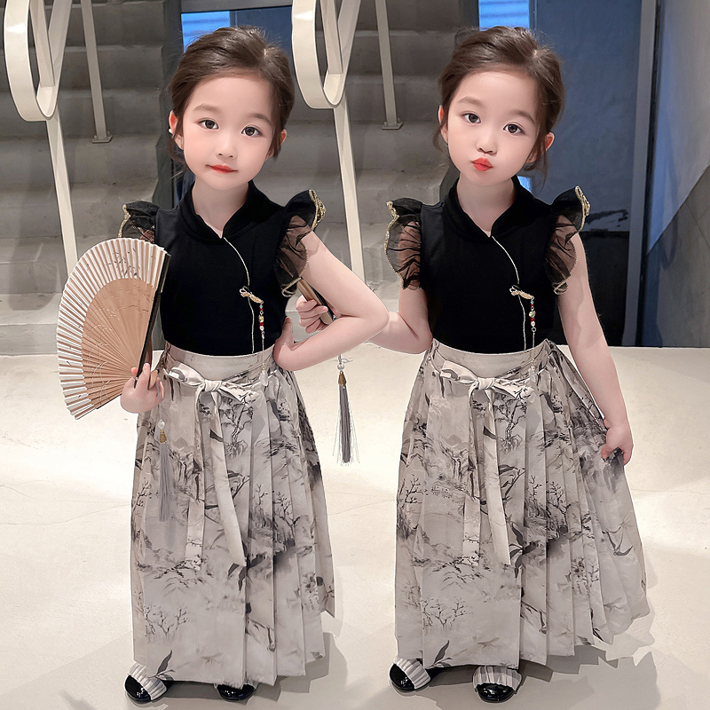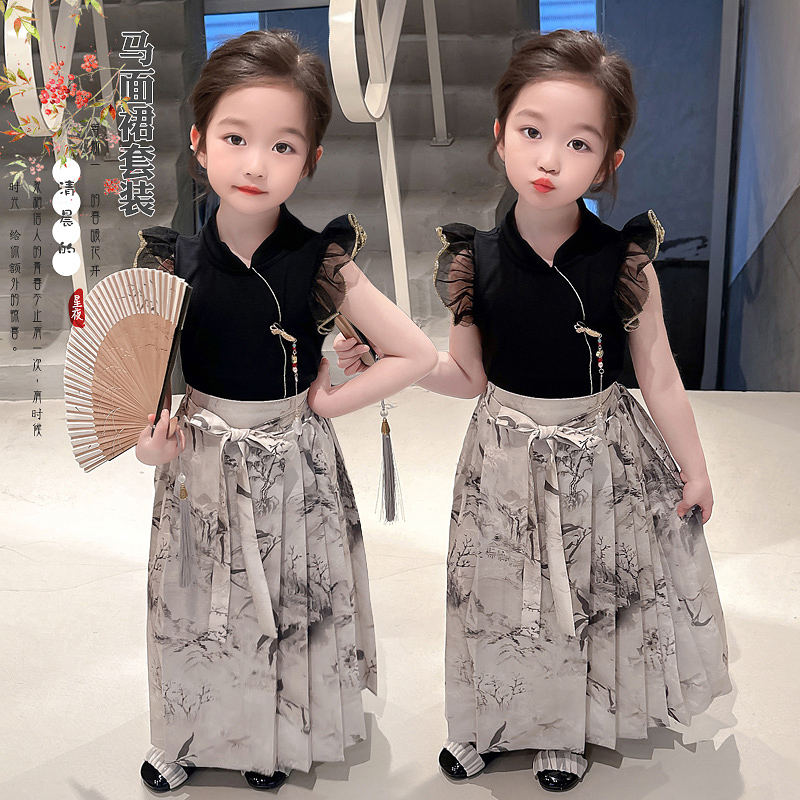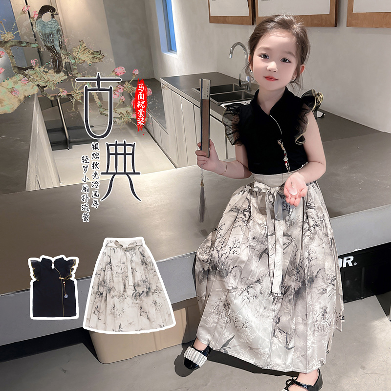 夏新中式 裙子两件套水墨画马面裙套装 国风 女童短袖 小黄鸭2025新款