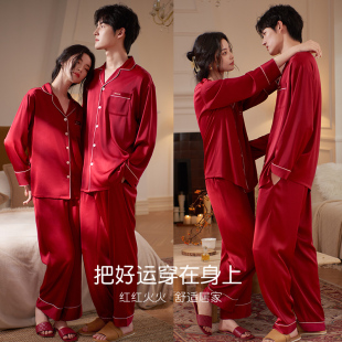 套装 轩靓冰丝情侣睡衣女春秋薄款 夏季 红色新娘结婚家居服男士 长袖
