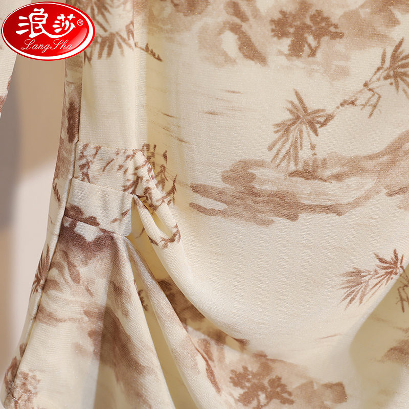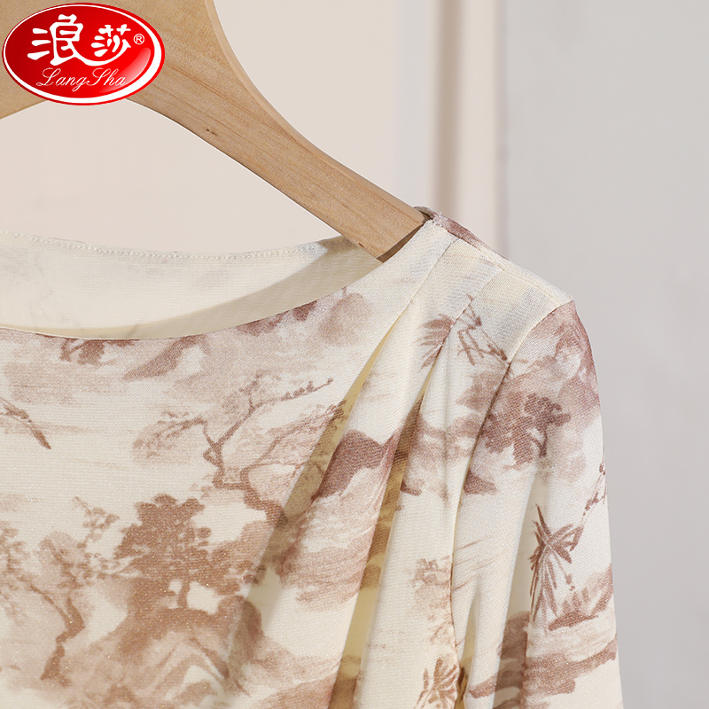 洋气中袖 女装 上衣 褶皱设计夏季 浪莎一字领印花网纱T恤女五分袖