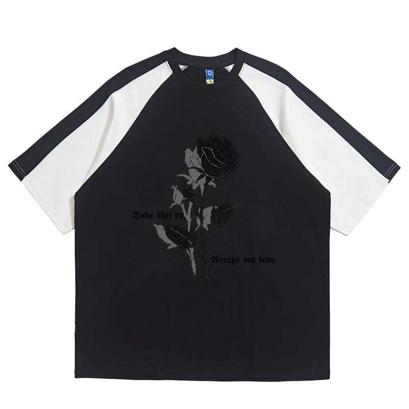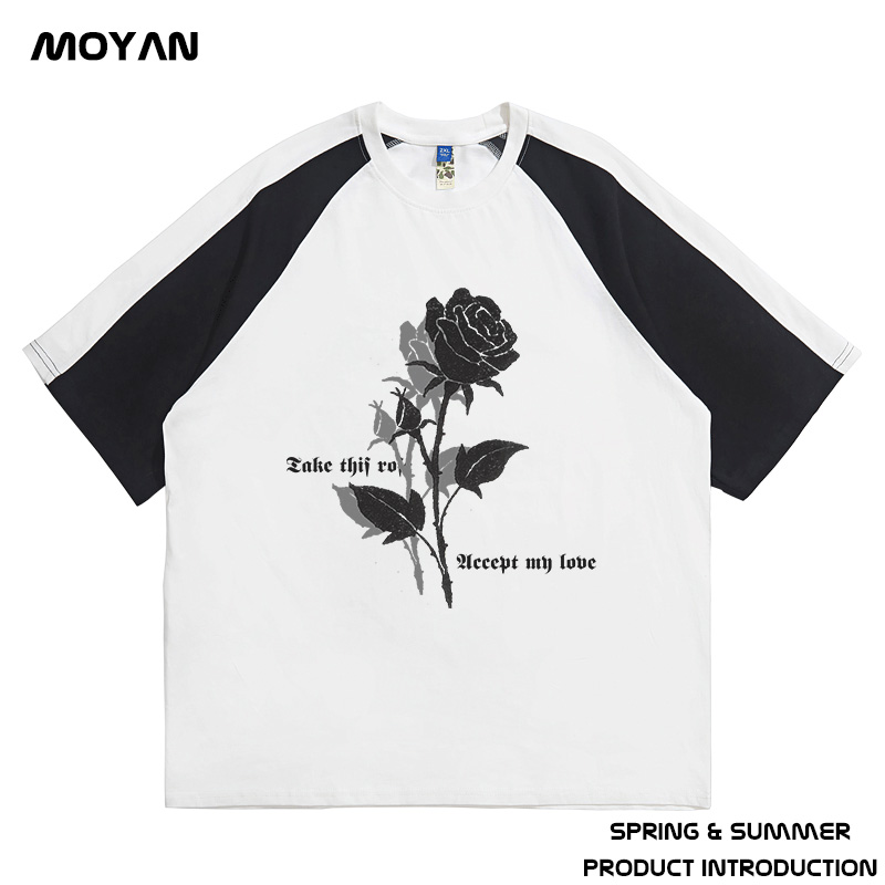 美式 t恤男夏季 潮牌ins街头痞帅宽松学生百搭体恤 短袖 玫瑰插肩大码