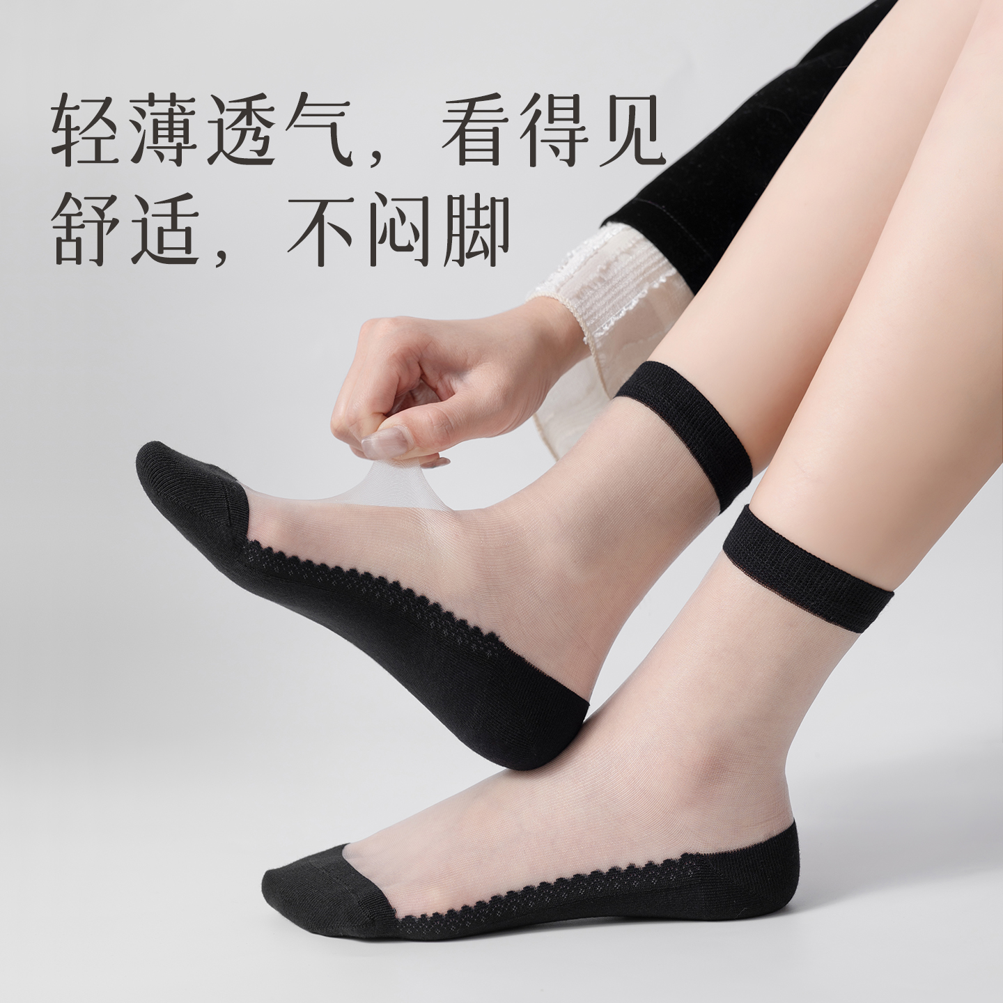 棉底丝袜女中筒袜子女透明水晶玻璃丝冰丝抗菌防臭防滑黑色中筒袜