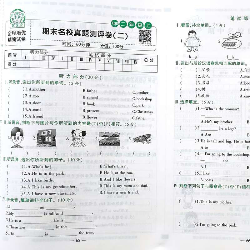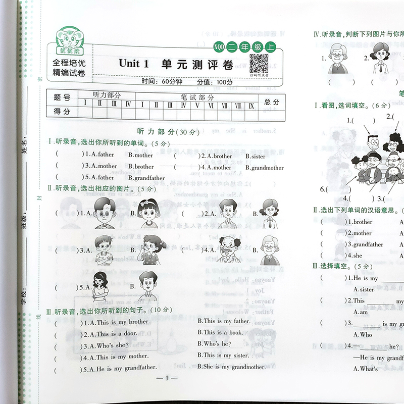1一起点SL听力同步测试卷子 一起新起点XQD黄冈海淀全程培优必刷卷小学2二年级上册英语卷子人教版 2025新 二年级上册英语试卷人教版