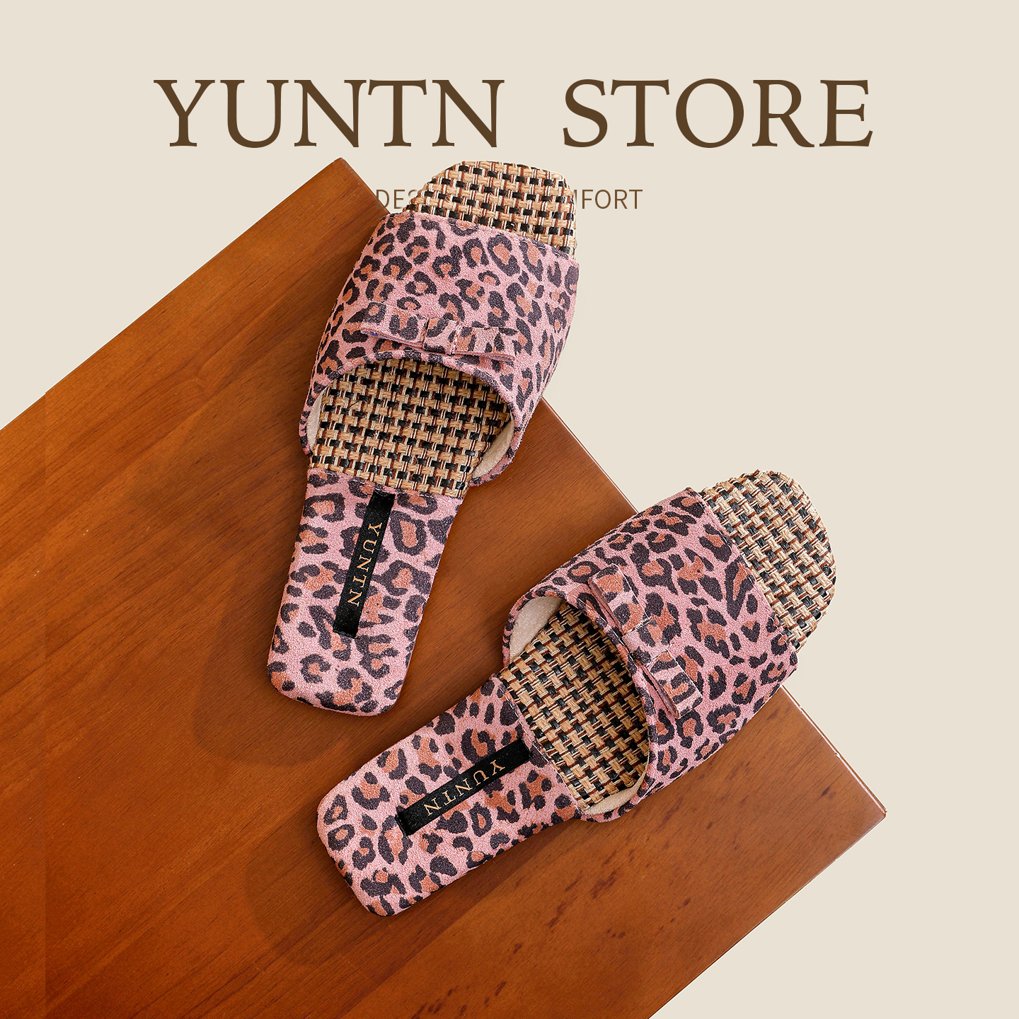 夏季 女亲肤亚麻防滑轻便牛筋底 轻奢复古豹纹哑光皮面蝴蝶结凉拖鞋
