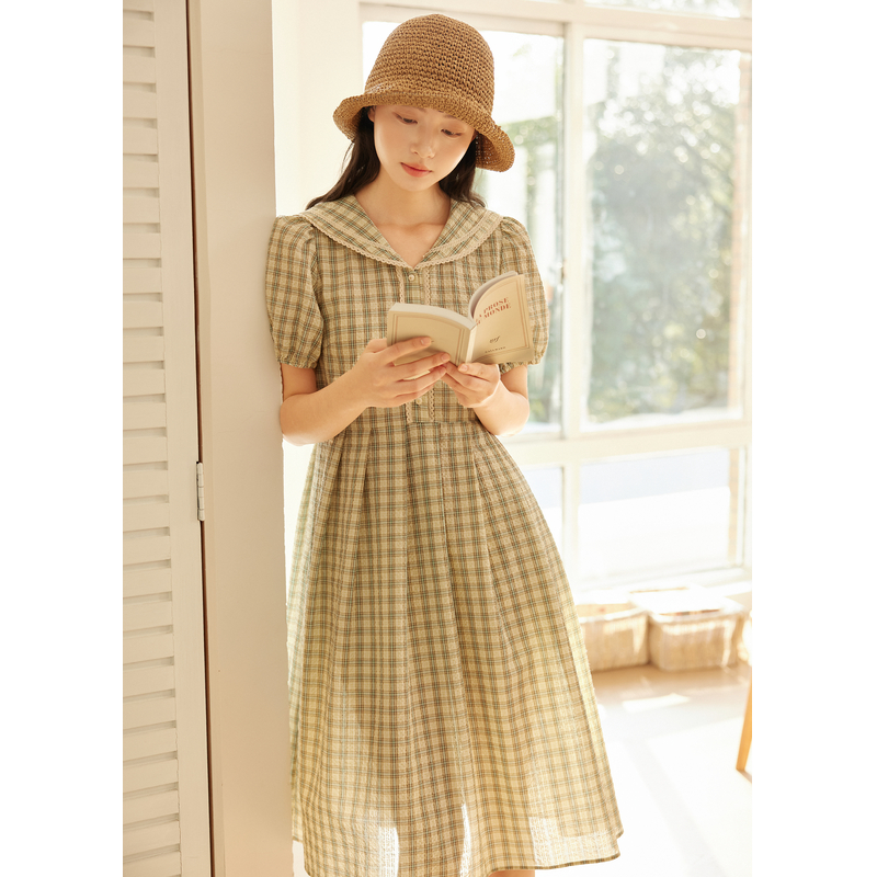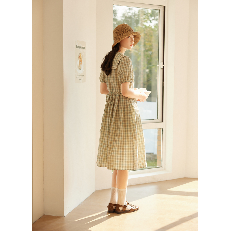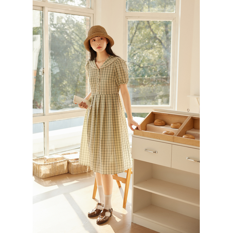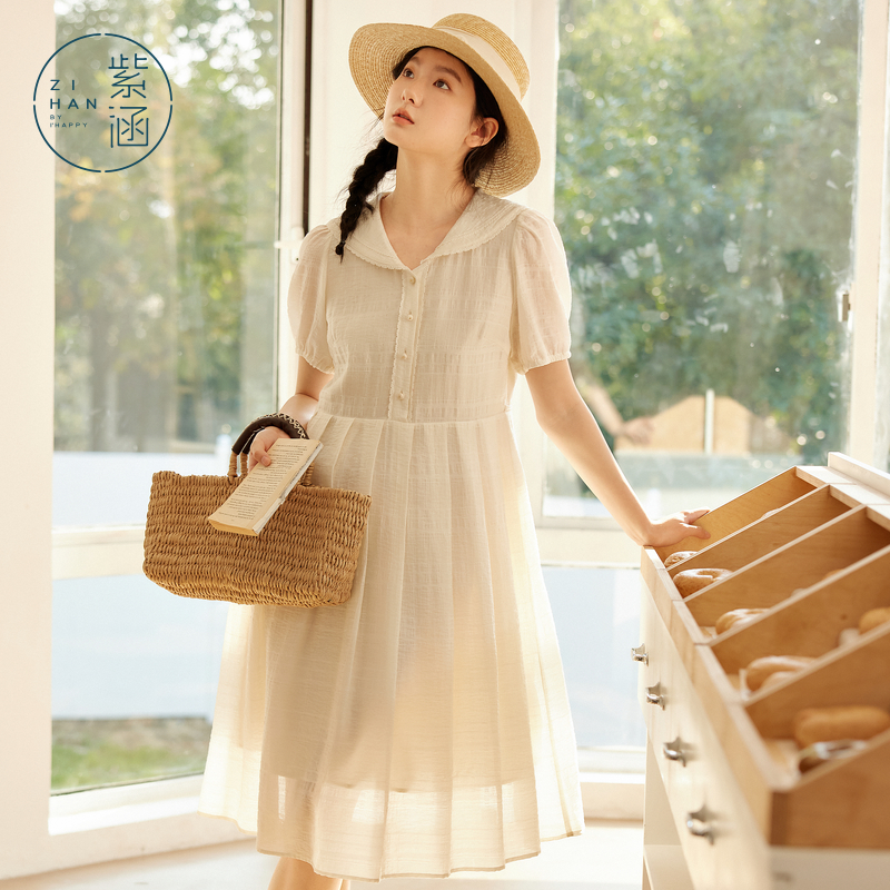 法式 新款 温柔甜美收腰a字裙 连衣裙女2025年夏季 紫涵娃娃领泡泡袖