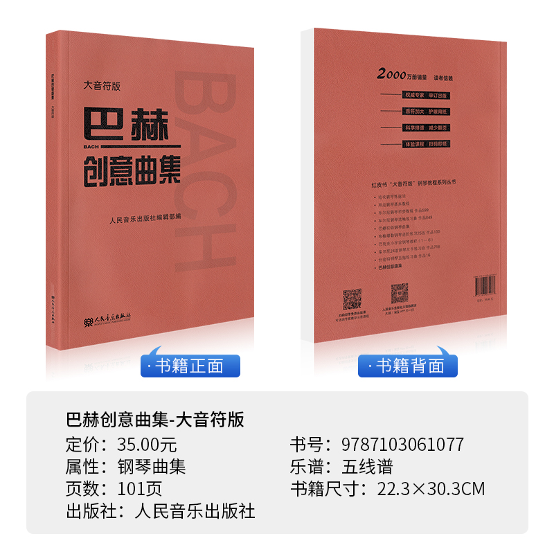 社正版 人民音乐出版 书籍 人音红皮书大字版 基础练习曲谱教程书籍 巴赫创意曲集 成人儿童钢琴初学入门教材 大音符版