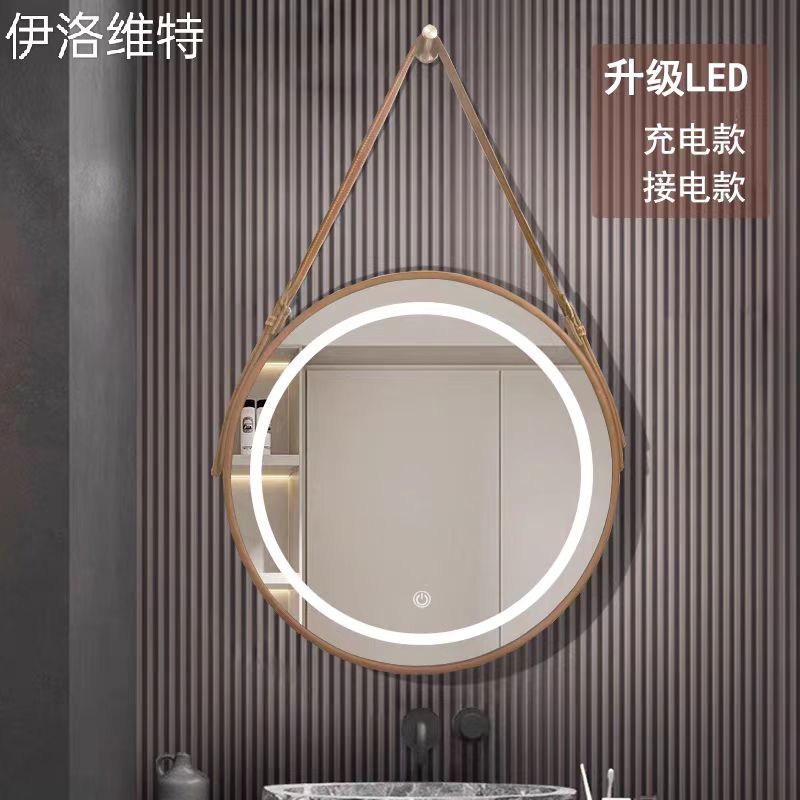 北欧皮带全包无缝化妆镜led灯智能镜洗手间悬壁挂浴室镜子圆吊镜