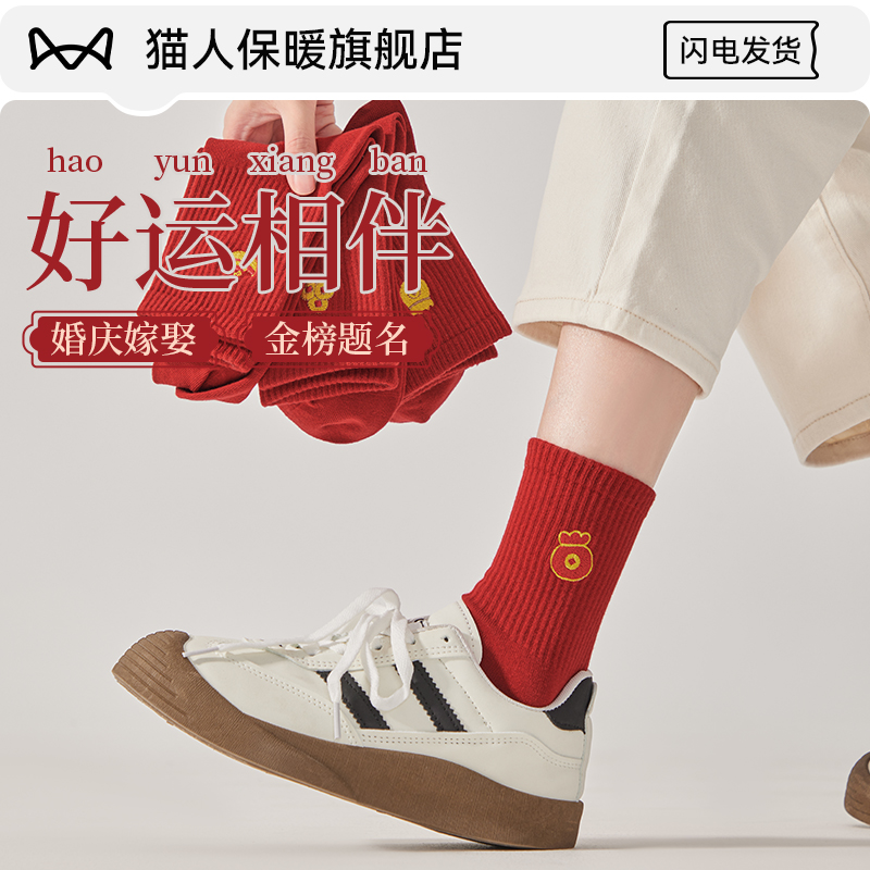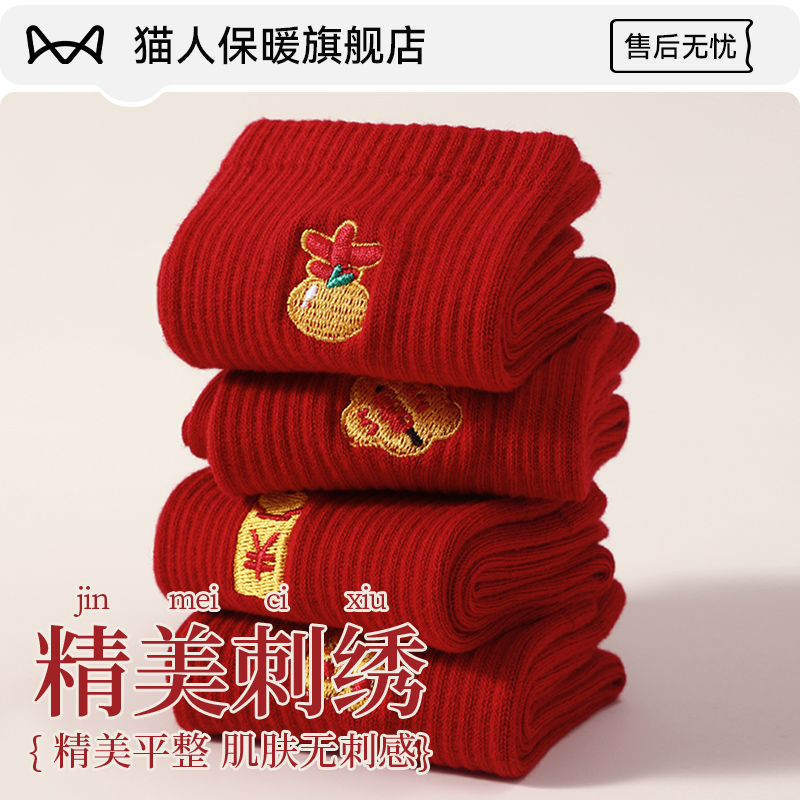 猫人本命年袜子蛇年新年礼物秋冬款 男女士红色袜子发财棉袜中长筒