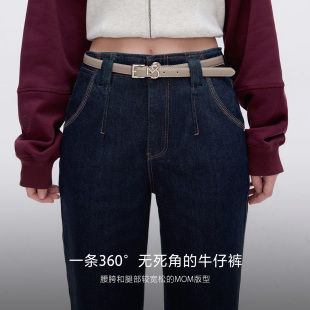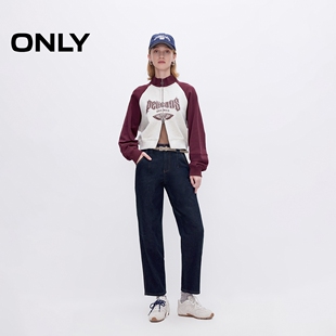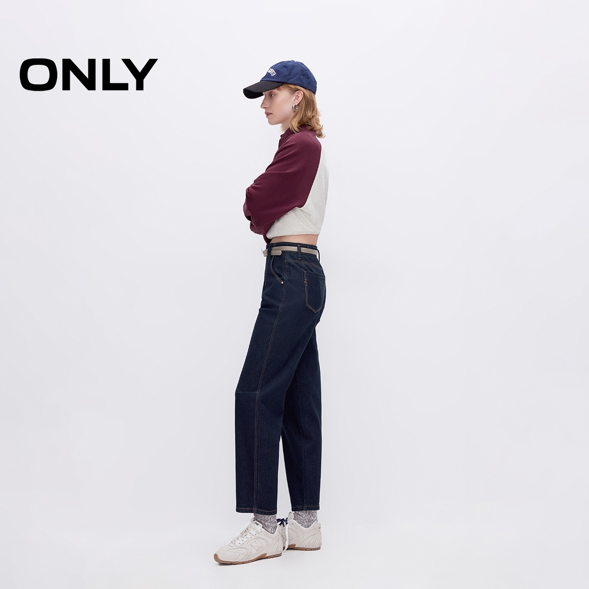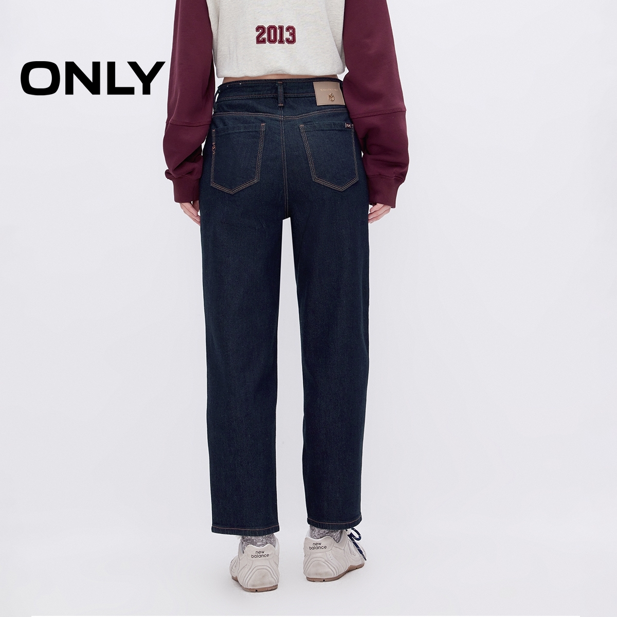 女 做旧复古皮牌斜插高腰松弛显瘦宽松直筒牛仔裤 ONLY2025秋季 新款