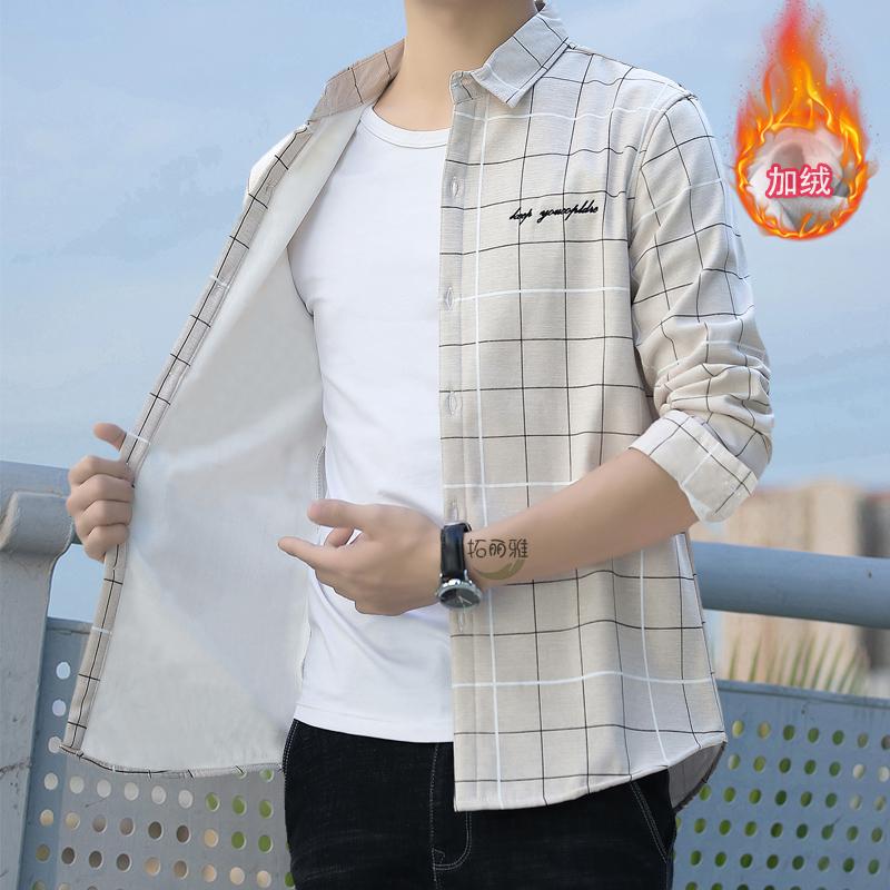 拓丽雅秋冬高档帅气男保暖加绒衬衫 格子休闲青年上衣外套 百搭长袖