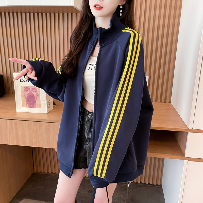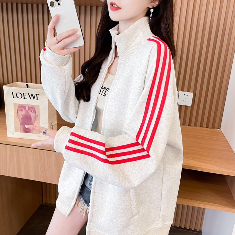 韩版 新款 宽松百搭慵懒风运动外套 卫衣女春秋季 三条杆立领拉链薄款