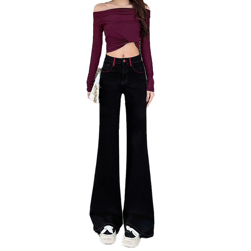 辣妹高腰撞色显瘦遮肉喇叭裤 2025年新款 子 女春秋装 黑色微喇牛仔裤