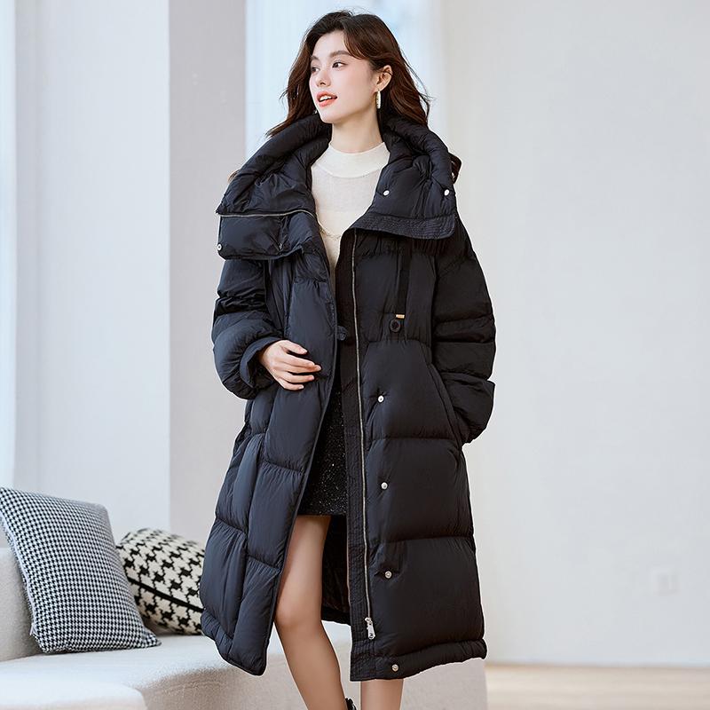 时尚 鸭鸭中长款 韩版 新款 保暖加厚过膝黑金外套潮 羽绒服女连帽冬季
