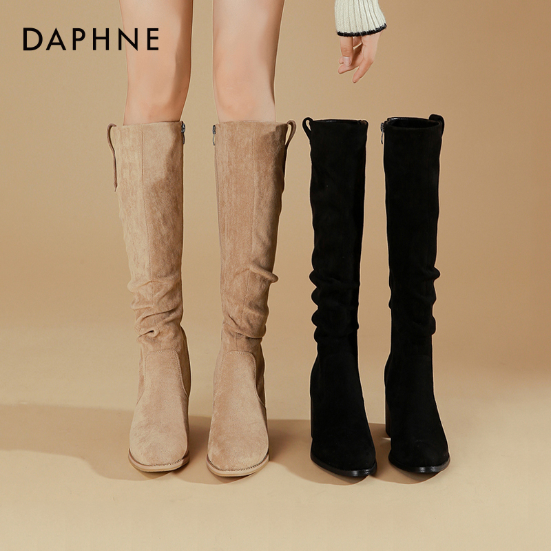 达芙妮棕色长筒靴女2025秋冬新款 高筒粗跟骑士靴复古绒面堆堆靴子