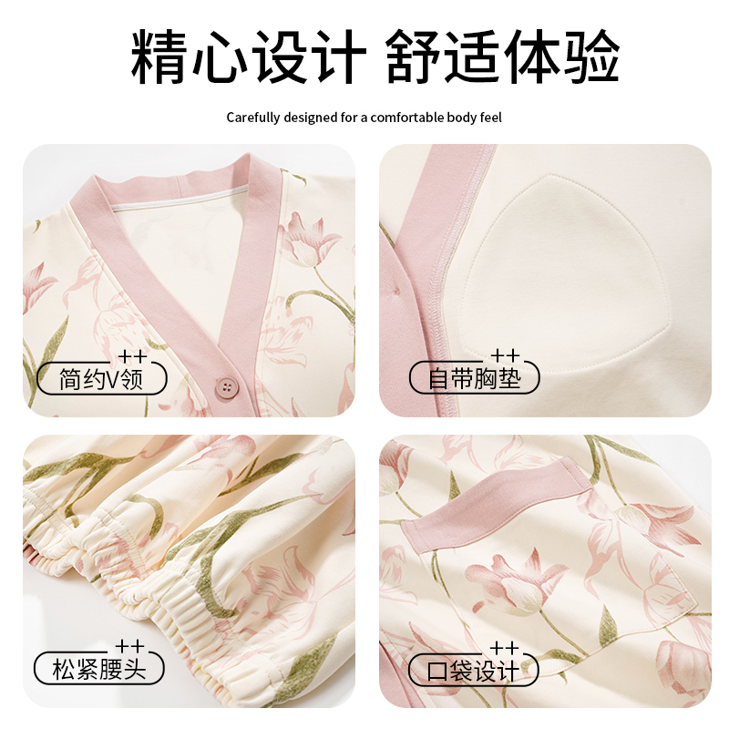 加大码 套装 家居服春秋 秋冬季 芬腾女士睡衣空气棉夹层纯棉加厚长袖