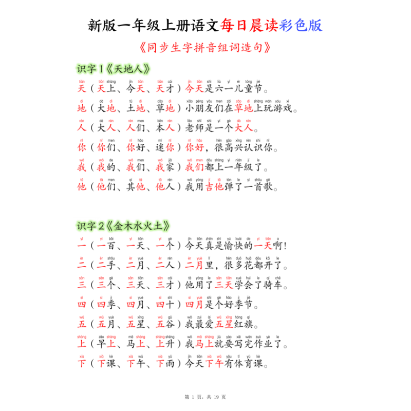 25秋新版 阅读本一上课文重点内容梳理归纳课本同步识字汉语拼音生字组词造句全册重点知识汇总 一年级上册语文每日晨读彩色版